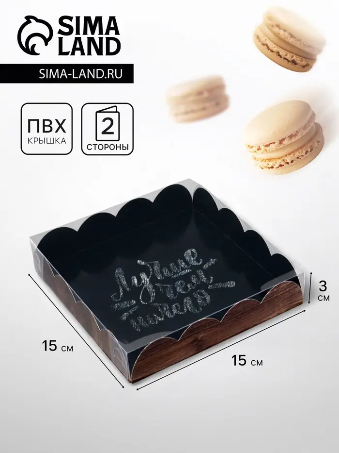 Прочный картон обеспечивает надежную защиту содержимого, а прозрачная крышка позволяет сразу оценить внешний вид угощений без необходимости открывать коробку.