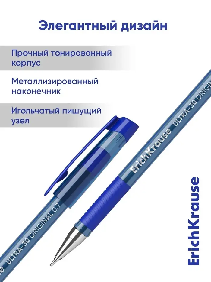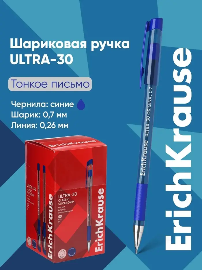 Ручка шариковая ErichKrause. ULTRA-30 Gold Stick&Grip Classic, синий стержень, узел 0.7 мм, резиновый упор