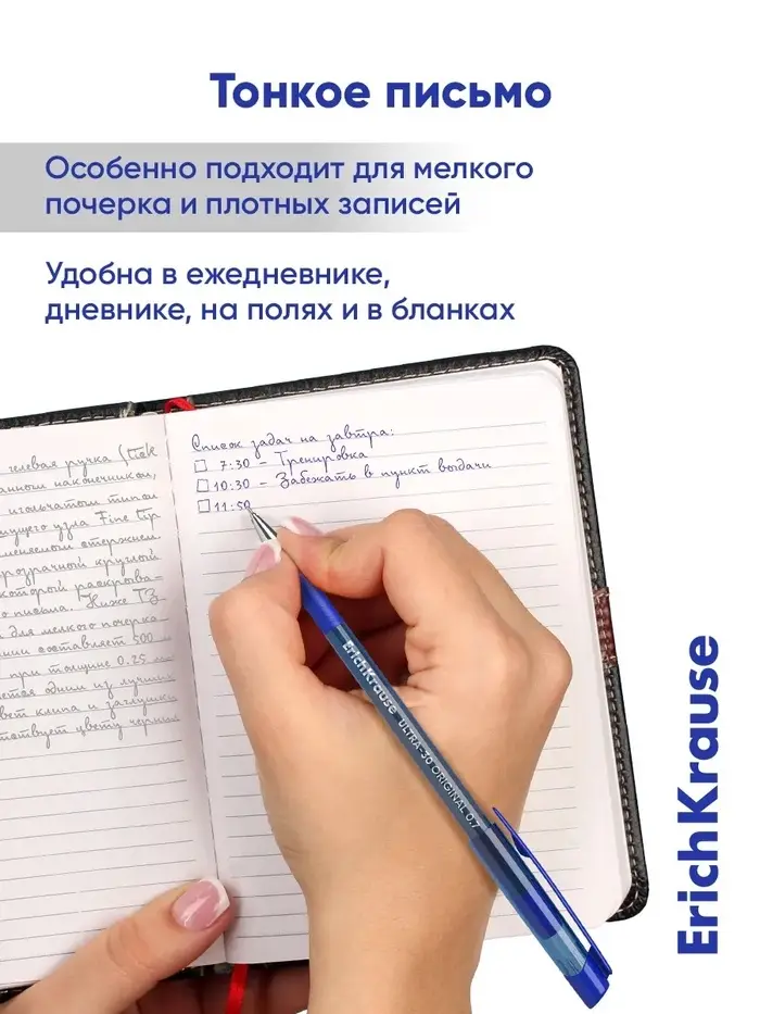 - Тонкая линия от шарикового узла 0.7 мм подходит для мелкого почерка и заполнения таблиц.