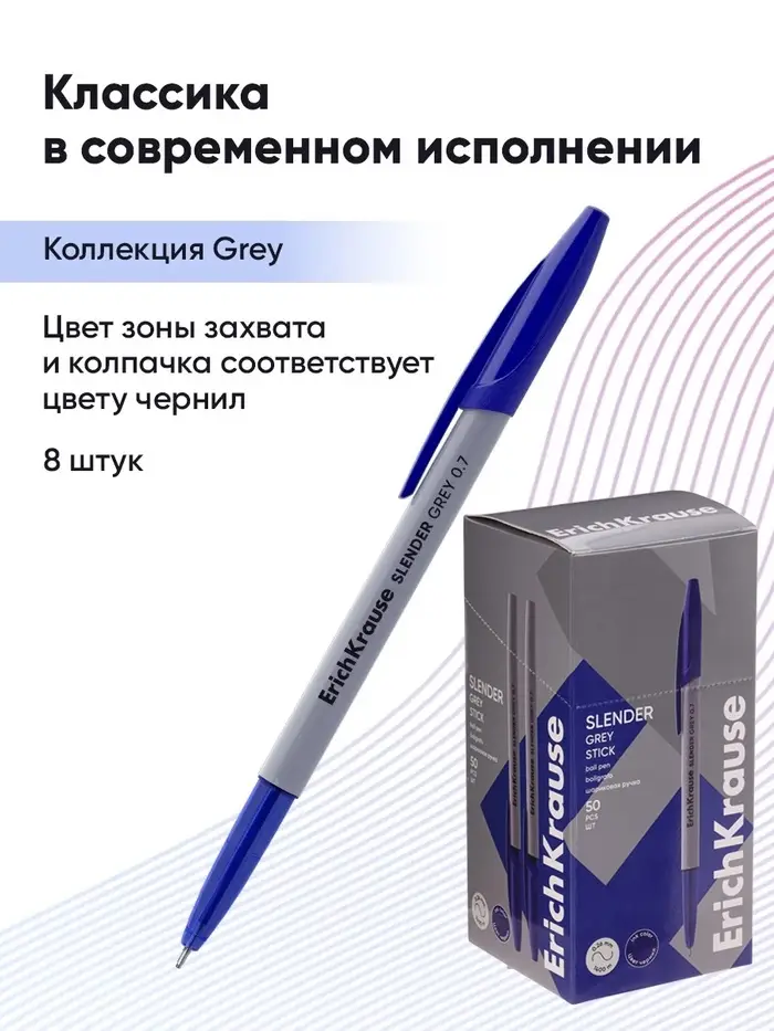 Ручка шариковая ErichKrause. Slender Stick Grey, Super Glide, синий стержень, узел 0.7 мм