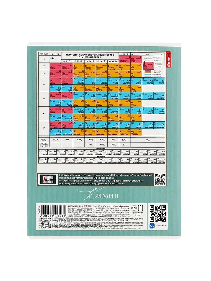 Эта тетрадь по химии в стилистике «Буквицы» помогает организовать записи формул, уравнений и опытов. Она создаёт системный подход к изучению предмета — от таблицы Менделеева до органических соединений.