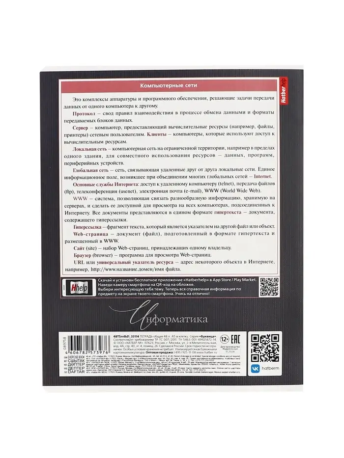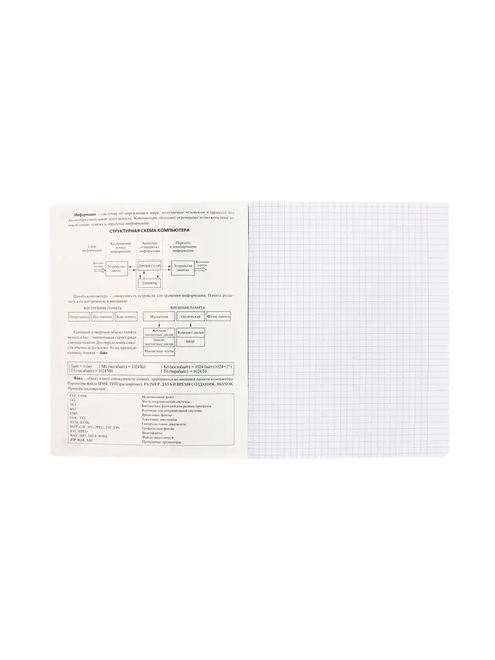 Тетрадь по информатике помогает структурировать теорию и практические задания. Ее лаконичный дизайн серии «Буквица» создает рабочее настроение, а ключевые схемы и таблицы на обложке заменяют дополнительные шпаргалки. Все основные понятия для уроков всегда перед глазами.