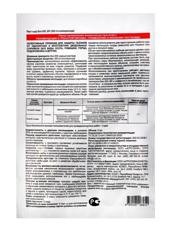 БИС-300 - уникальный гербицид для борьбы с однолетними и многолетними сорняками на газоне и посадках земляники в период вегетации.Обладает избирательным действием, подавляя только сорную растительность. Полностью уничтожает не только наземную, но и корневую систему сорняков.БИС-300 отличается исключительно высокой эффективностью в борьбе с осотом, ромашкой, горцами, одуванчиками, подорожником и пр., уничтожает сорняки на всех стадиях развития.Хорошо проникает в листья сорных растений и быстро передвигается в корневища, прекращая рост, и вызывая отмирание как надземной, так и подземной части сорняка.Идеален для поддержания в чистоте взрослых газонов. Период защитного действия: Оказывает гербицидное действие на чувствительные сорные растения в течении всего сезона. Гербицид избирателен к растениям сахарной свеклы, рапса ярового и озимого, льна-долгунца, кукурузы, газонным злаковым травам. Скорость воздействия: подавление роста сорняков происходит в течение нескольких часов после проведения обработки. Первые видимые симптомы действия препарата становятся заметны через 4-6 часов. Не фитотоксичен. Безопасность: Участок земли, с которого снята загрязненная почва, обрабатывают 3-5%-ным раствором кальцинированной соды и перекапывают. Загрязненную почву и пролитый препарат в контейнерах обрабатывают раствором хлорной извести и промывают водой. Обезвреживание отходов пестицида проводить путем обработки их 5 %-ным раствором щелочи или 7-10 %-ным раствором натриевой соли с последующим термическим обезвреживанием. Освободившуюся тapy промывают водой, обрабатывают раствором, ополаскивают водой, приводят в непригодное для повторного использования.Хранение при температуре от 0 °С до плюс 30 °С. Не допускается хранение препарата совместно с пищевыми продуктами, вдали от воздействия прямых солнечных лучей, попадания влаги, загрязнения и механического повреждения. Не допускается совместное транспортирование и хранение препарата с кормами и пищевыми продуктами.
