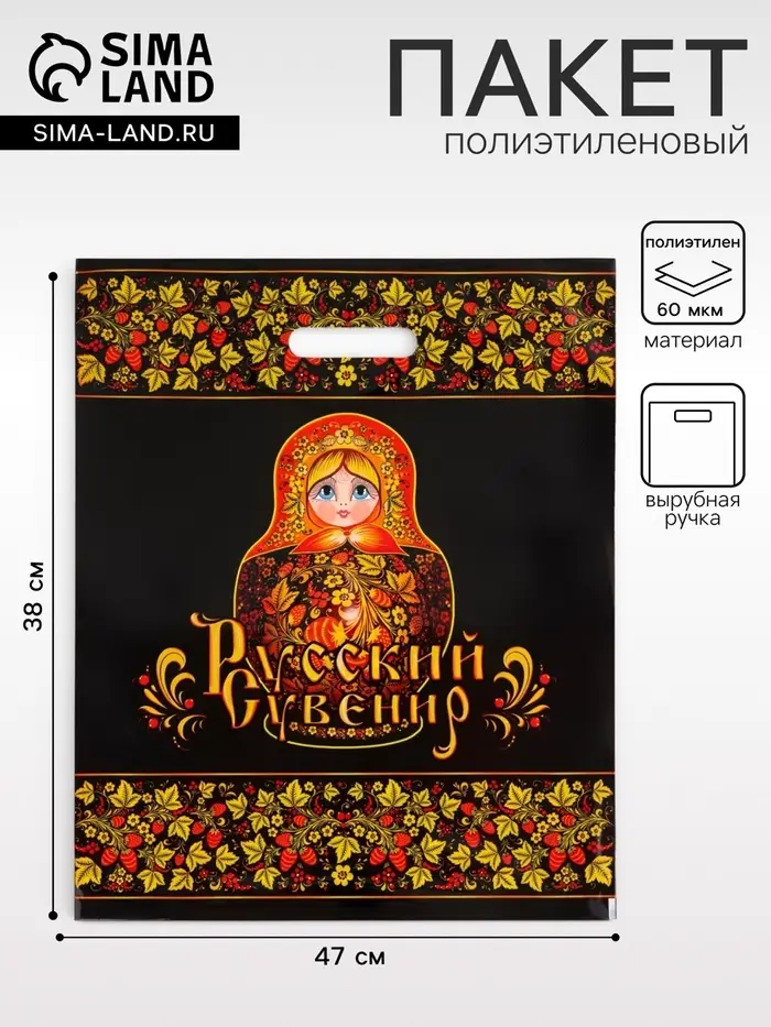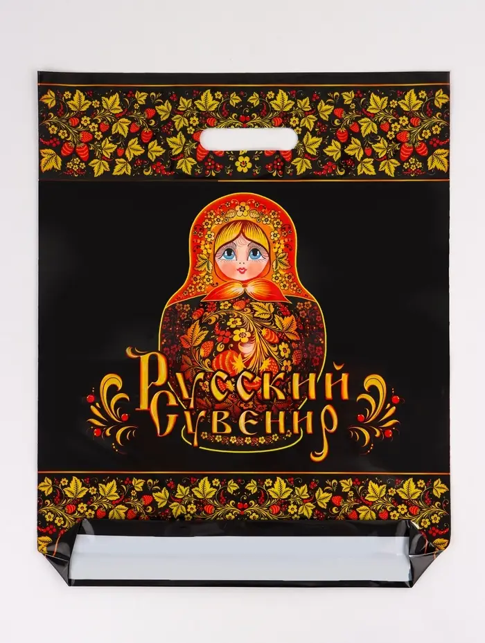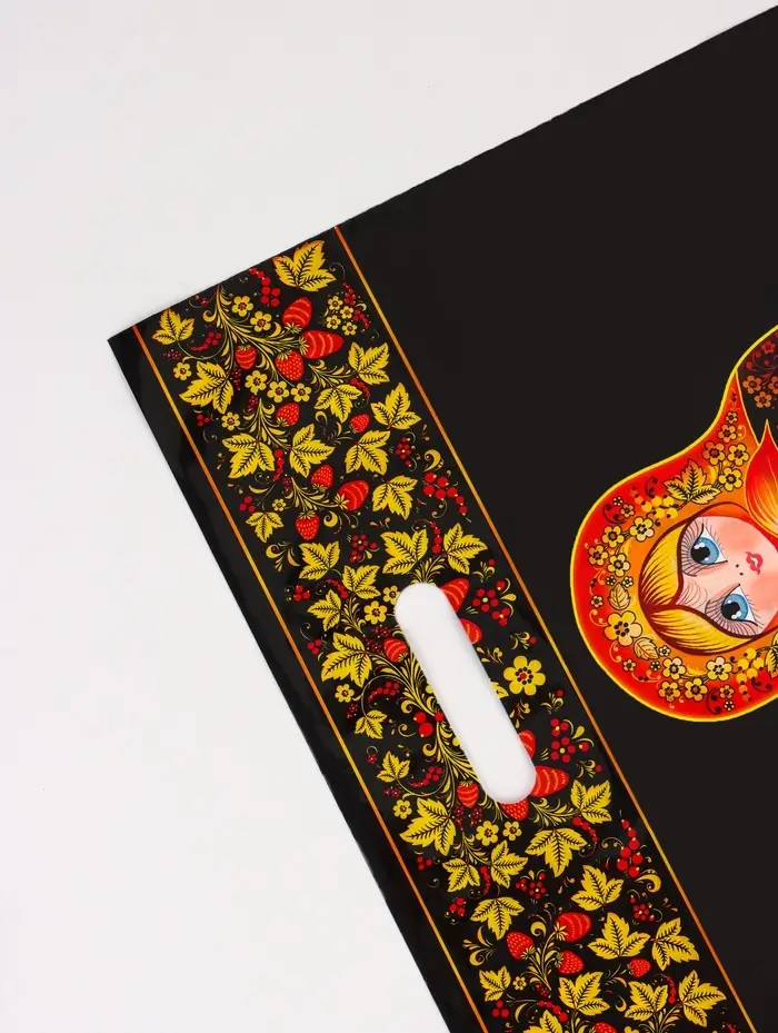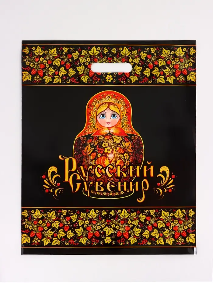 Особенности дизайна: Чёрный фон с традиционным орнаментом создаёт эффект дорогой упаковки. Такой пакет становится самостоятельным элементом подарка — его сохраняют для повторного использования или как память о событии. «Матрешка» — практичное решение для тех, кто ценит сочетание функциональности и культурной идентичности.