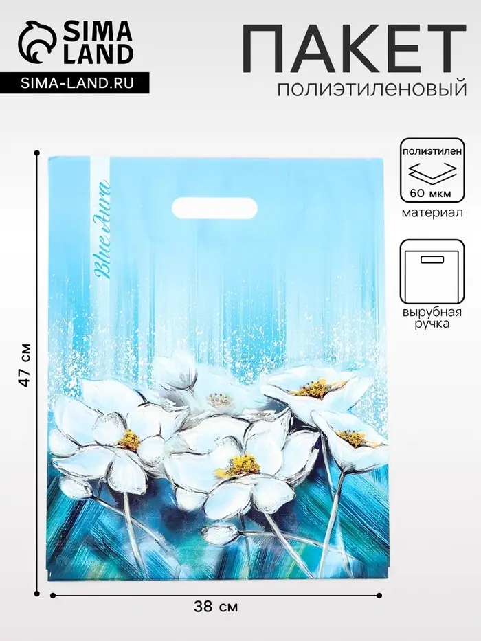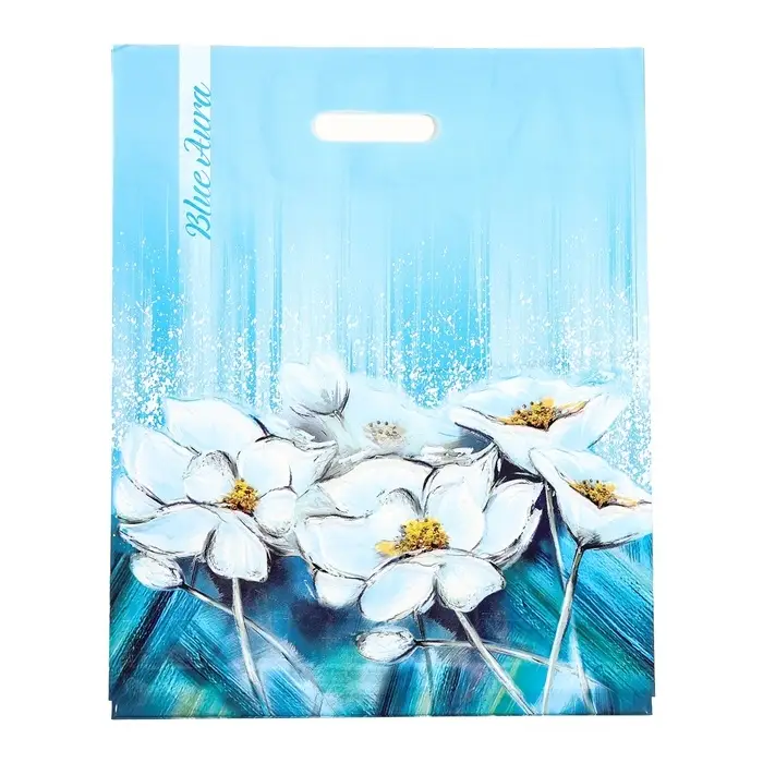 Лёгкость и свежесть в каждой детали. Голубой полиэтиленовый пакет с вырубной ручкой (38×47 см, 60 мкм) – упаковка с цветочным рисунком «Аура». Модель с донной складкой выдерживает до 6 кг груза.