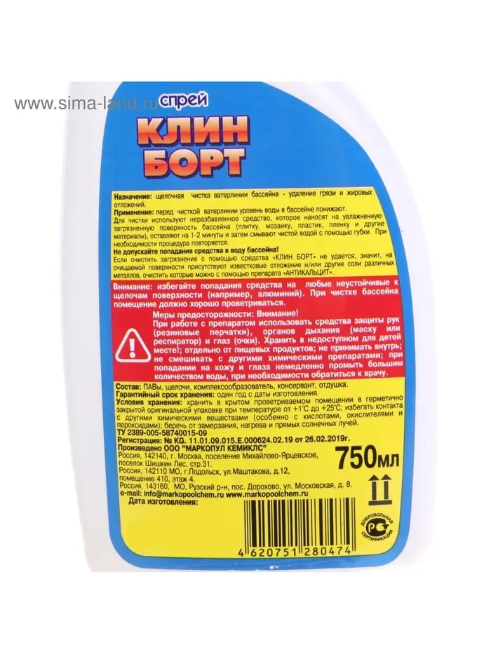 Для чистки используют неразбавленное средство, которое распыляют на загрязненную поверхность края бассейна, оставляют на 1-2 минуты и затем смывают с помощью губки. При необходимости процедура повторяется. Если очистить загрязнения с помощью средства «КЛИН БОРТ» не удается, значит, присутствуют известковые и / или металлические отложения, очистить которые можно с помощью препарата «АНТИКАЛЬЦИТ».