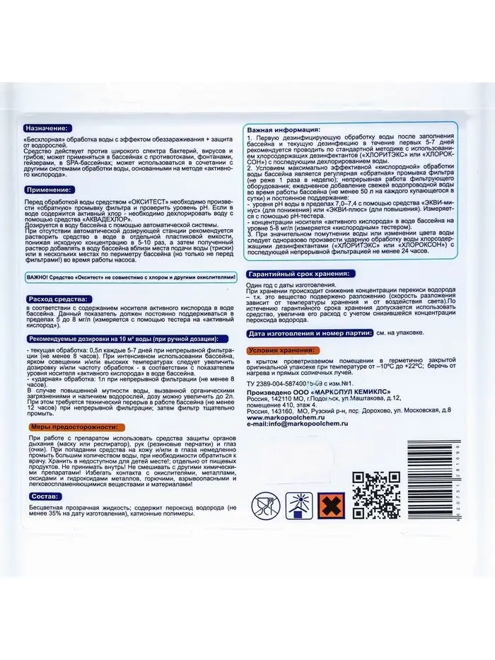 ВАЖНО! Средство «Окситест» не совместимо с хлором и другими окислителями!