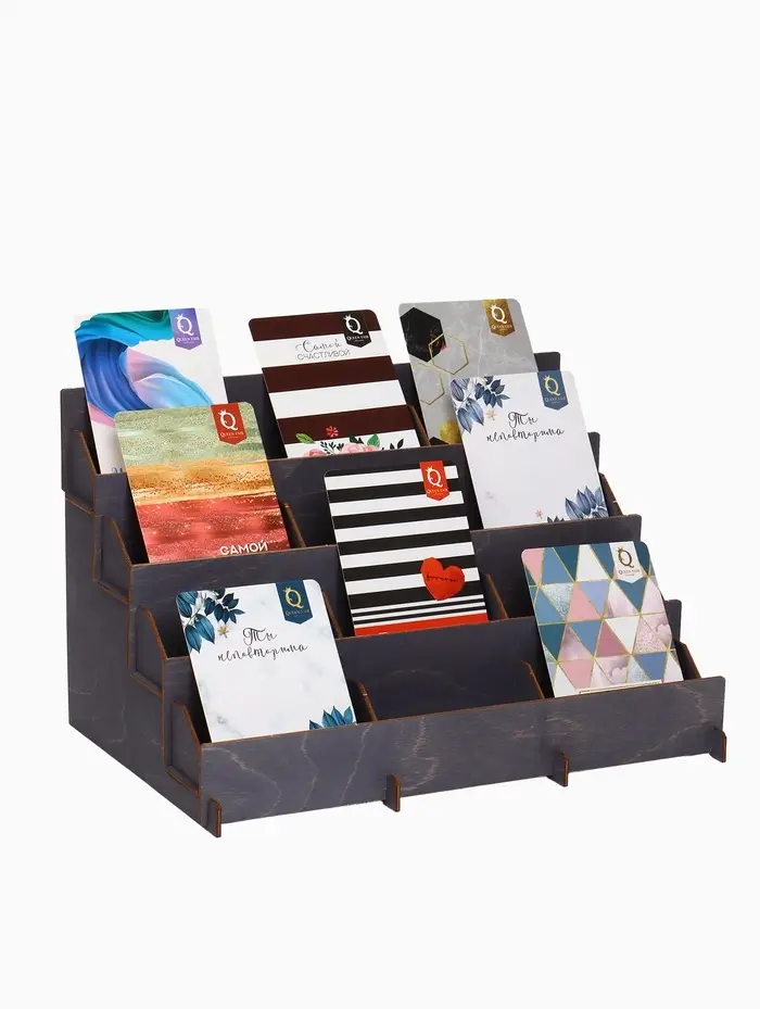 - Обеспечивает порядок и легкий доступ к открыткам и буклетам в офисе или магазине.