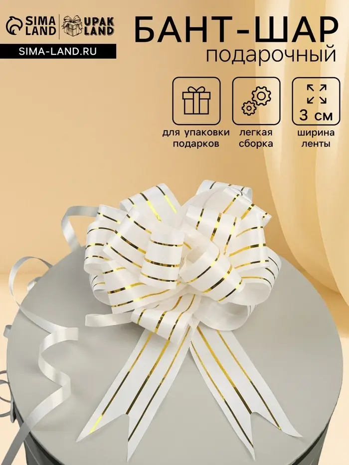 Подарочный Бант - шар №3 три золотых полосы, белый, для упаковки подарков