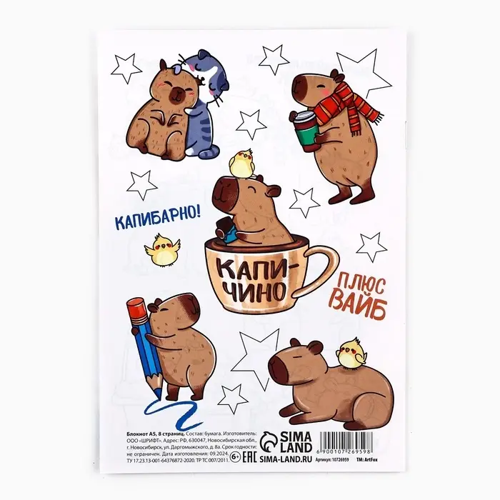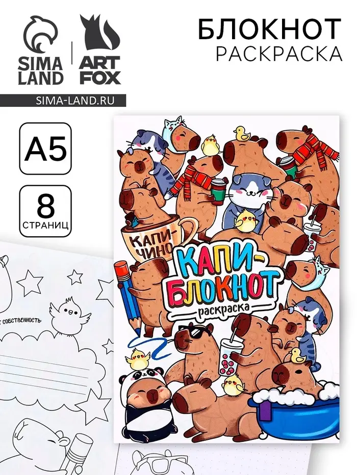 Блокнот раскраска А5, 8 страниц «Капибара»