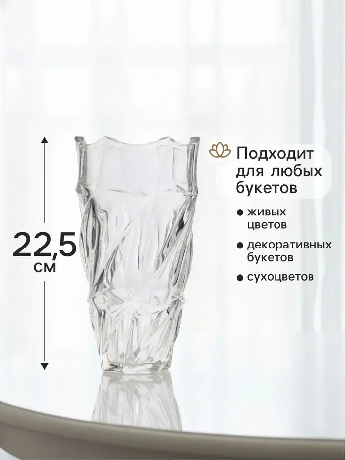 Настольная прозрачная ваза из стекла высотой 22,5 см — это элегантное решение для вашего интерьера. Изысканный дизайн и прозрачный материал позволяют этой вазе гармонично вписаться в любой стиль вашего дома, став ярким акцентом на столе, полке или подоконнике.