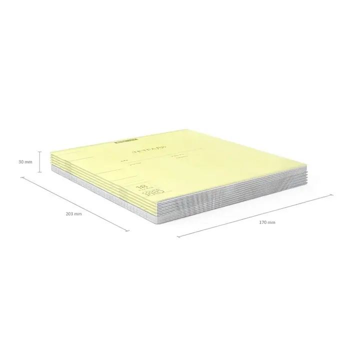 Тетрадь школьная ученическая формата А5+ (170x203 мм). Двойная обложка: внешняя выполнена из высококачественного износостойкого цветного пластика с фактурой «апельсиновая корка», внутренняя — из офсетной бумаги. В блоке 18 листов в линейку. Бумага офсетная плотностью 60 г/м2. Цвет линовки — синий. Скругленные уголки обложки и блока. Тип скрепления — скоба. Тетради упакованы в термоусадочную пленку по 10 штук