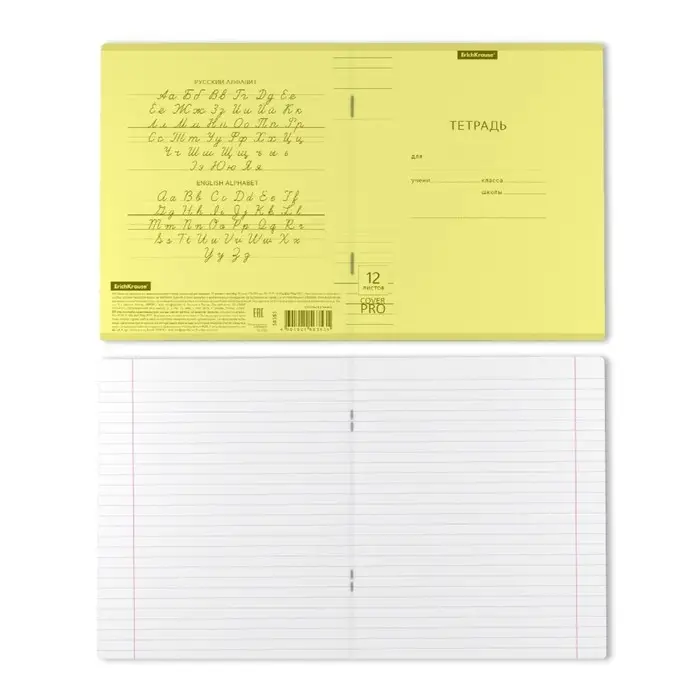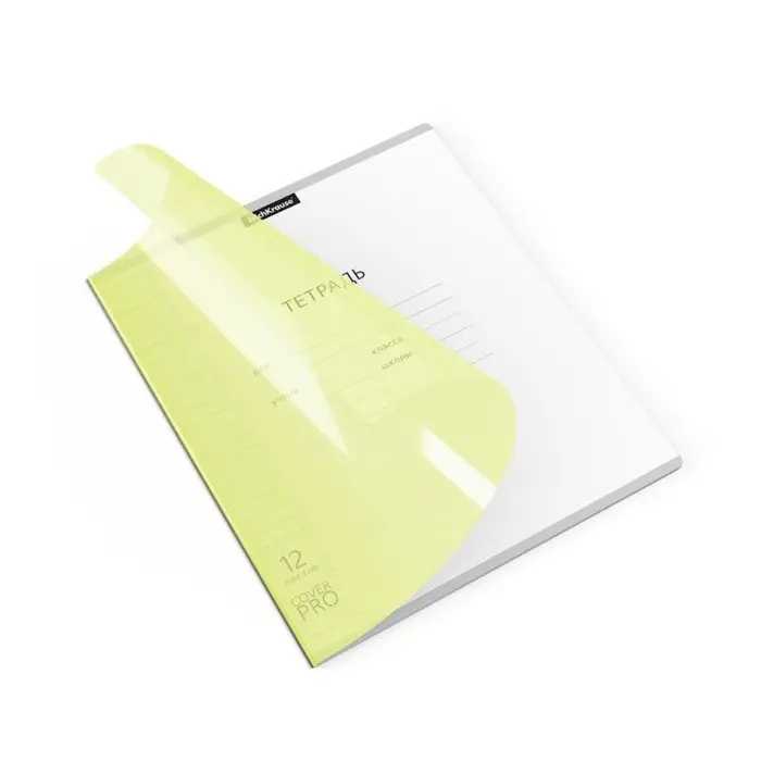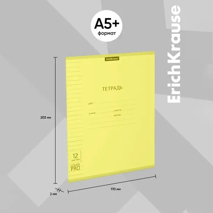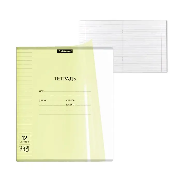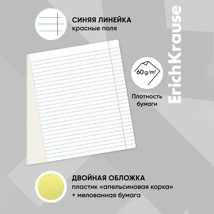 Тетрадь школьная ученическая формата А5+ (170x203 мм). Двойная обложка: внешняя выполнена из высококачественного износостойкого цветного пластика с фактурой «апельсиновая корка», внутренняя — из офсетной бумаги. В блоке 12 листов в линейку. Бумага офсетная плотностью 60 г/м2. Цвет линовки — синий. Скругленные уголки обложки и блока. Тип скрепления — скоба. Тетради упакованы в термоусадочную пленку по 10 штук.