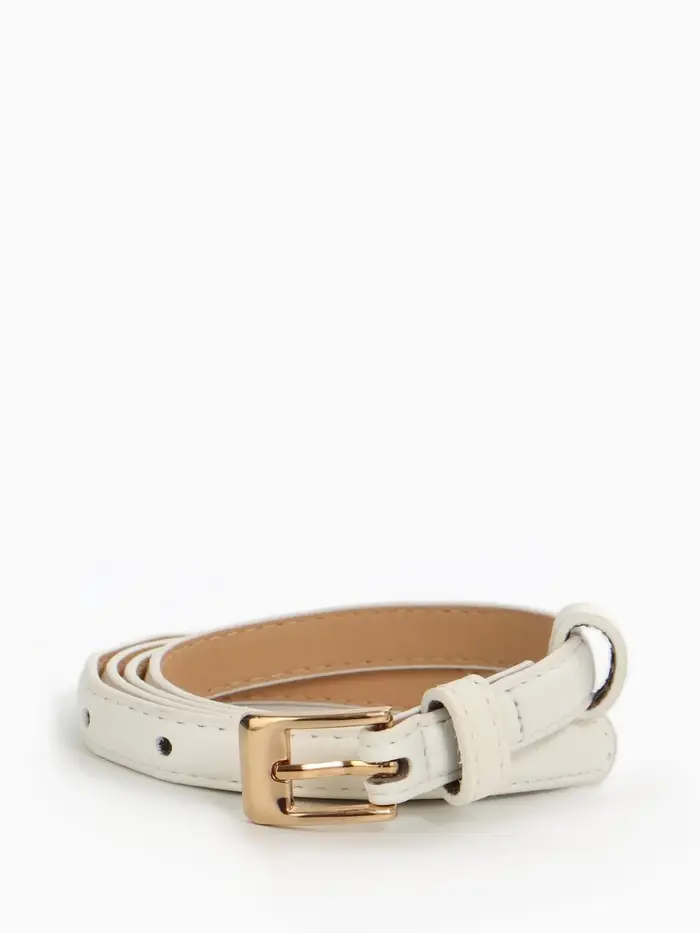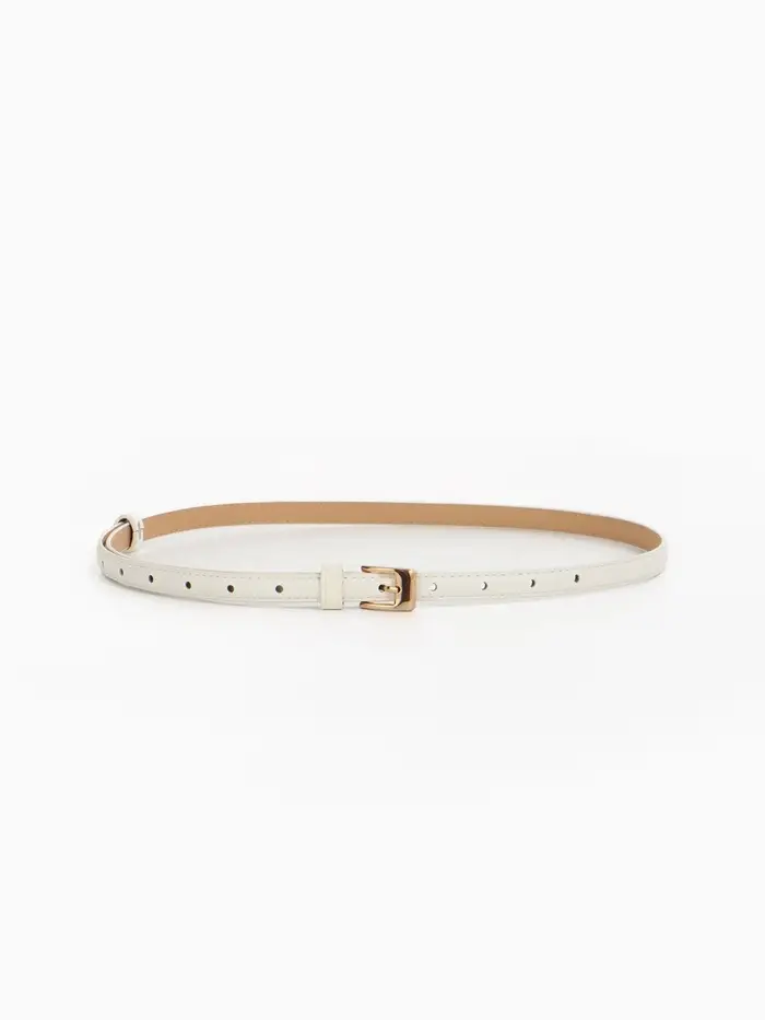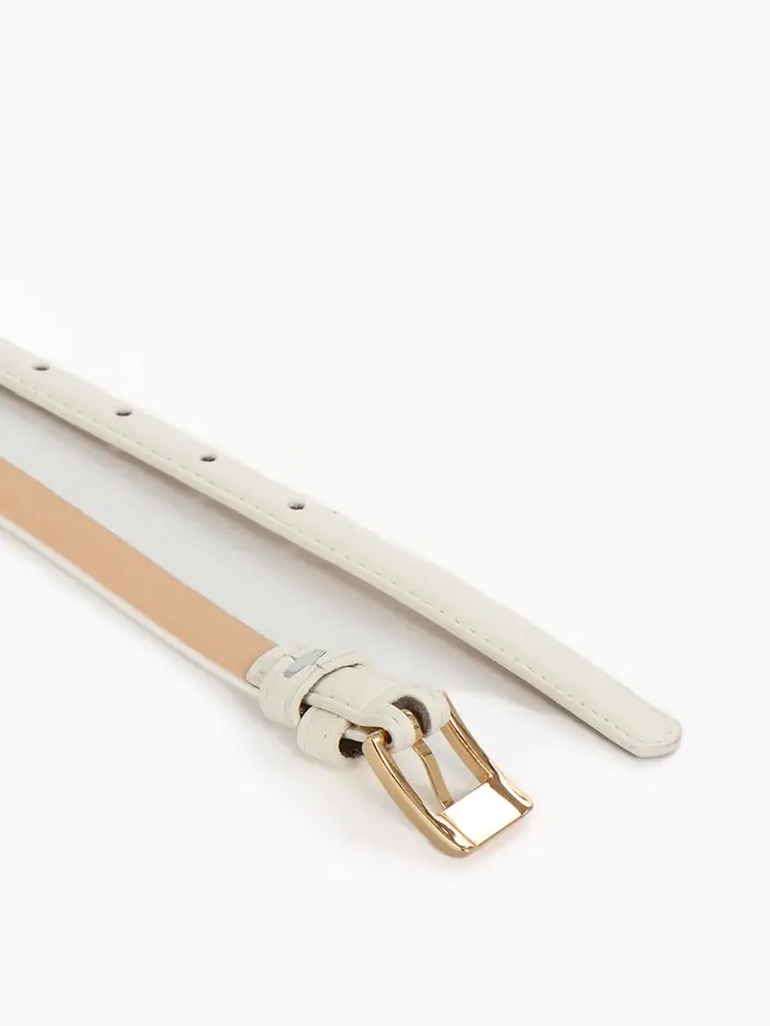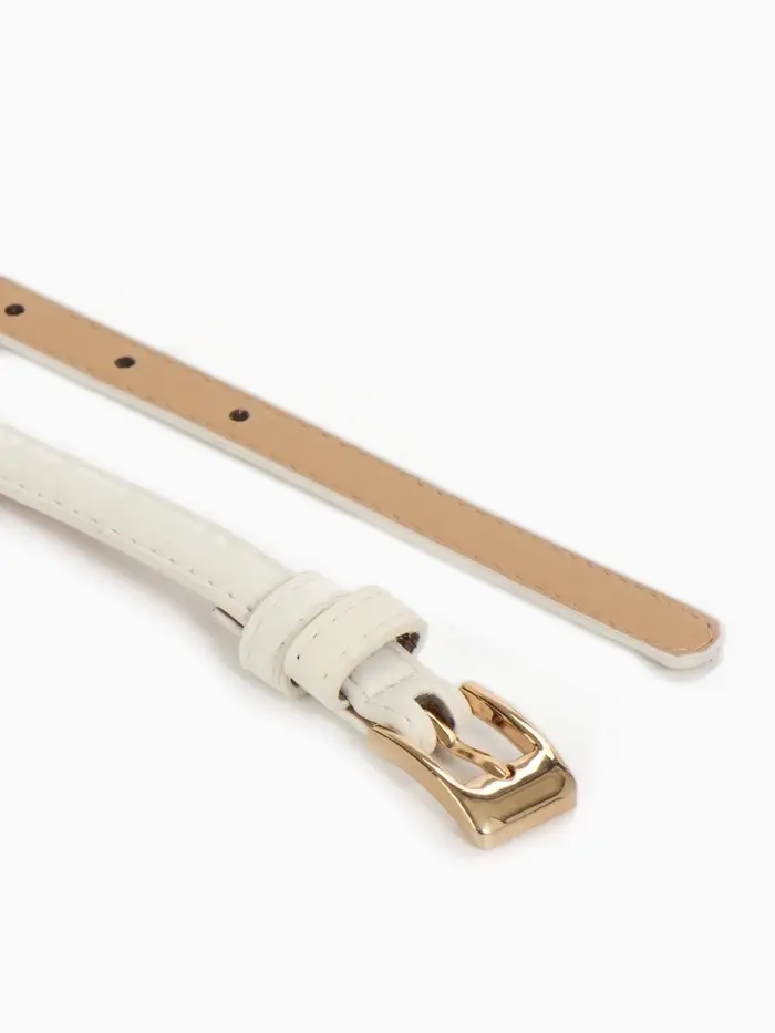 Элегантный белый ремешок с золотой пряжкой — универсальный аксессуар для создания летних образов. Узкий дизайн подчеркнёт талию, добавляя образу лёгкости и женственности.