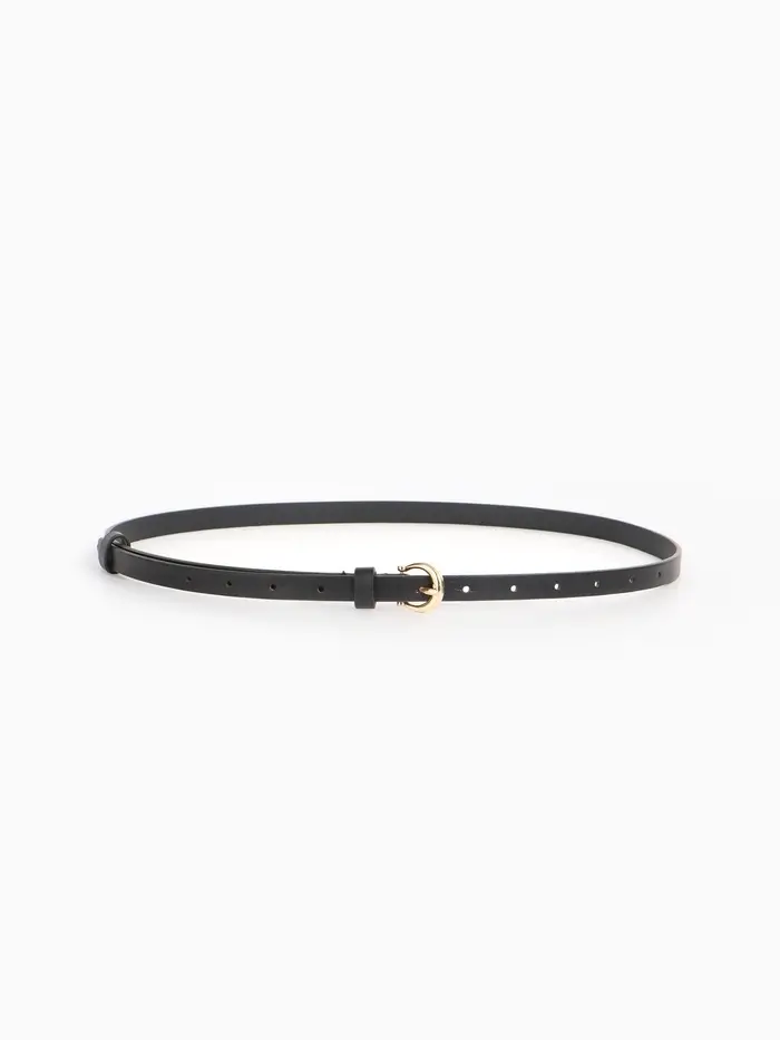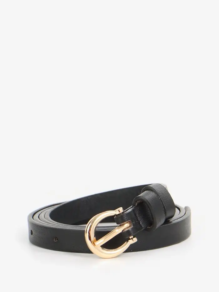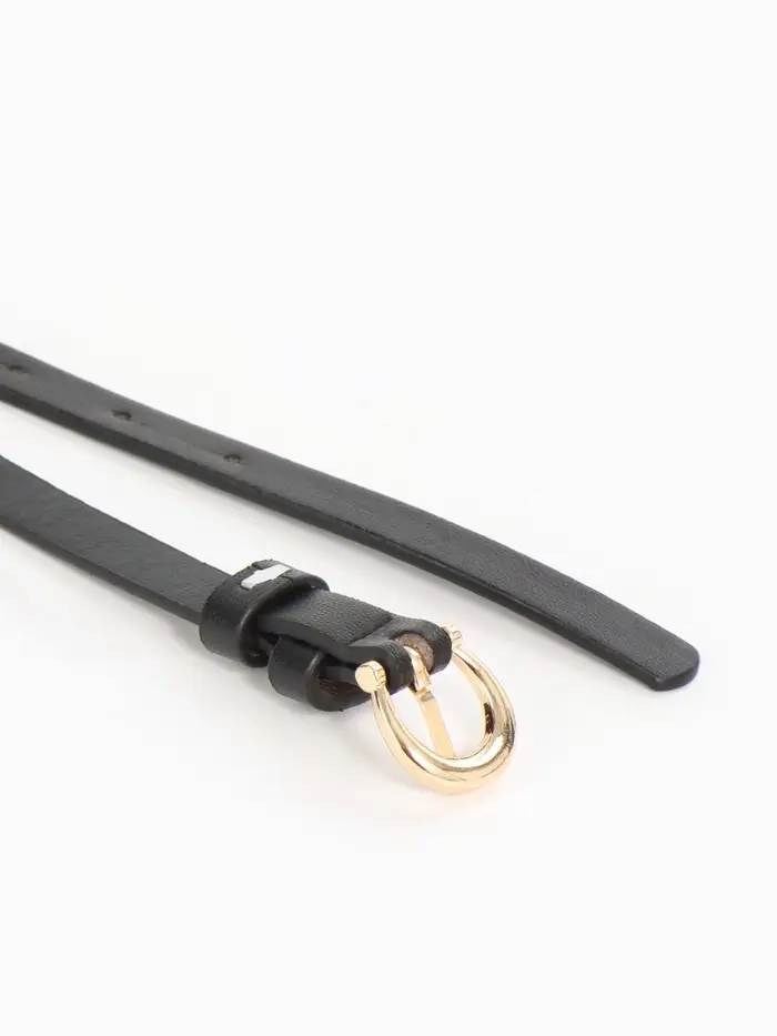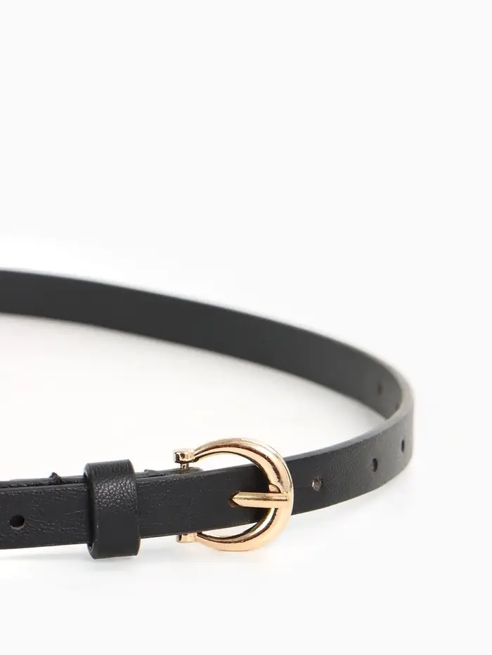 Узкий черный ремешок с золотой пряжкой — универсальный аксессуар для женского гардероба. Идеально подходит для повседневной носки, добавляя образу элегантности.