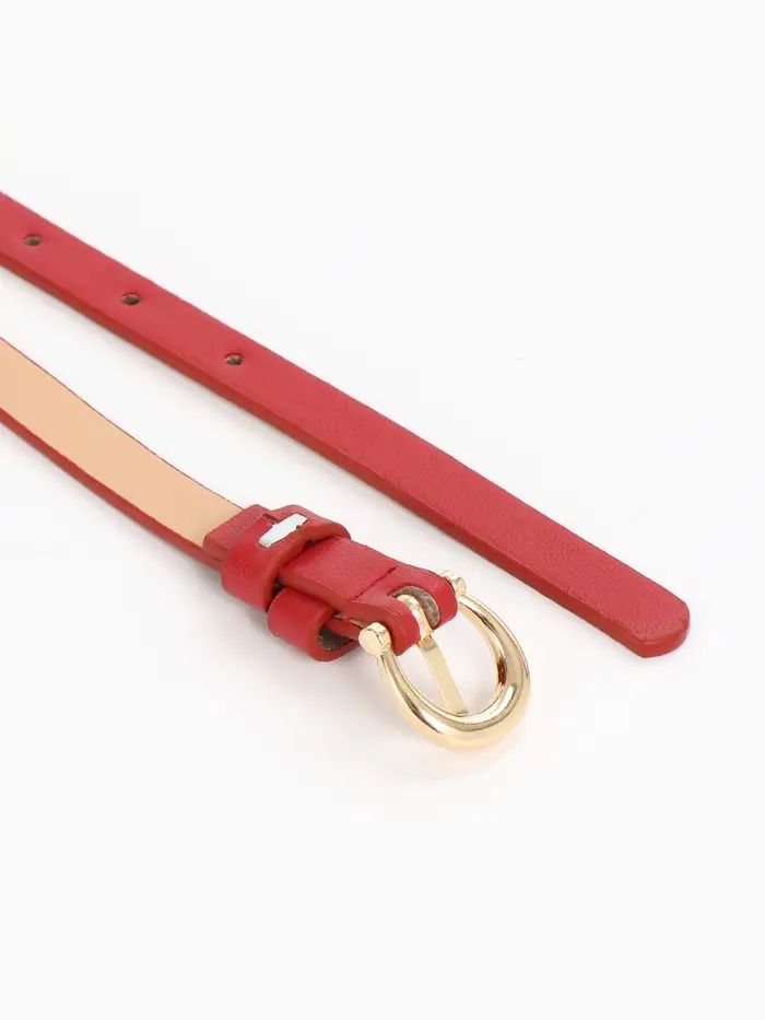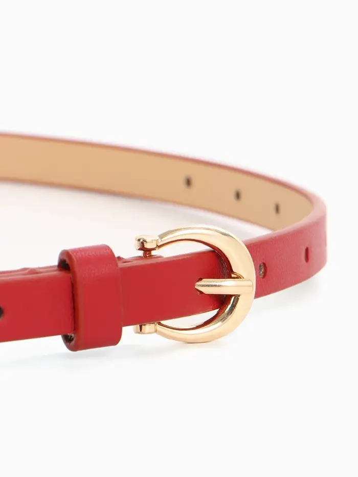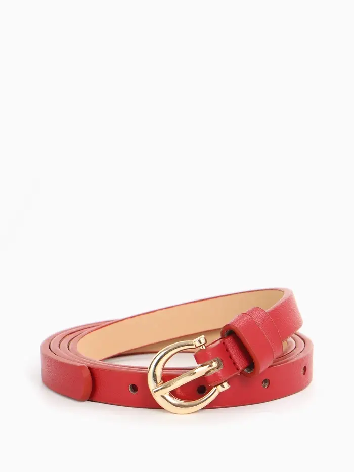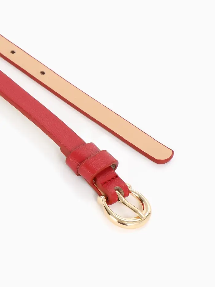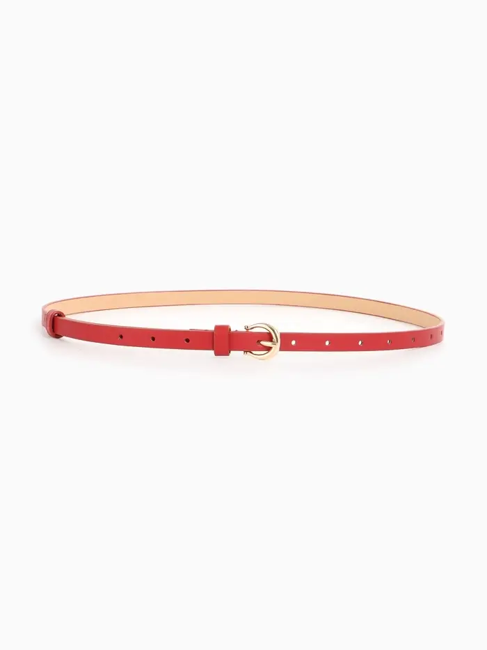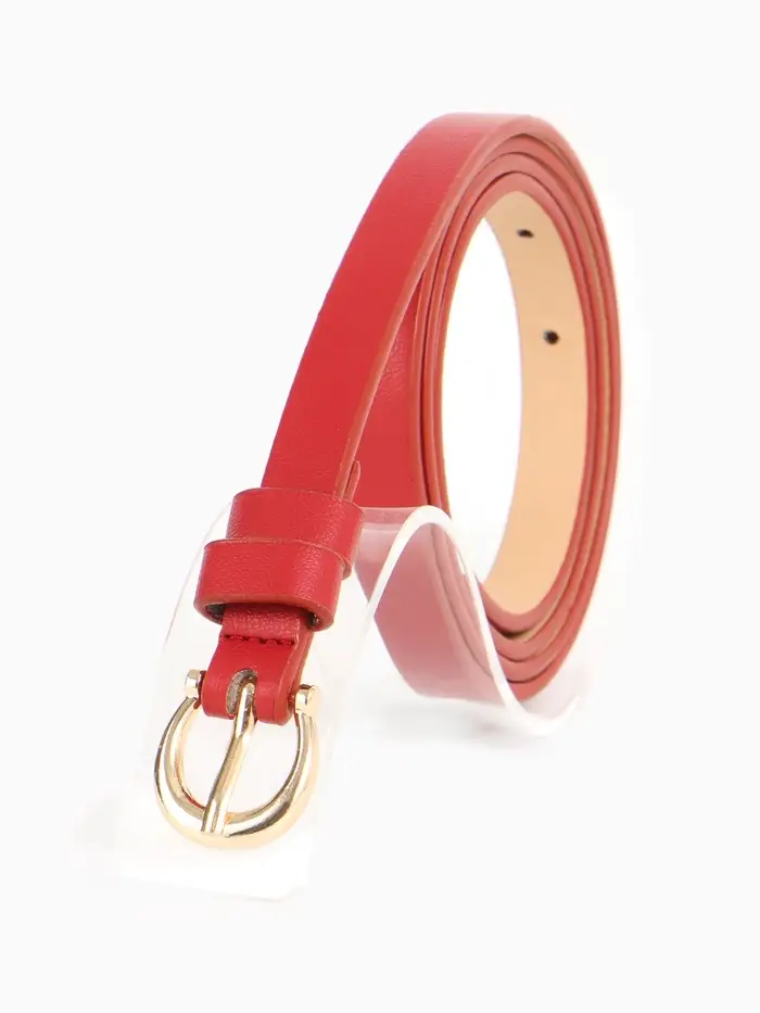 Яркий красный ремешок с золотой пряжкой — смелый акцент для современных образов. Узкий дизайн подчеркивает талию, добавляя образу женственности и стиля.