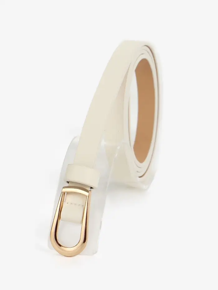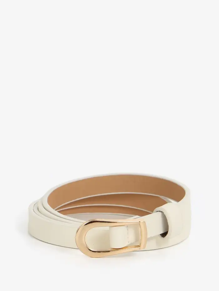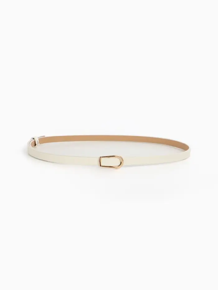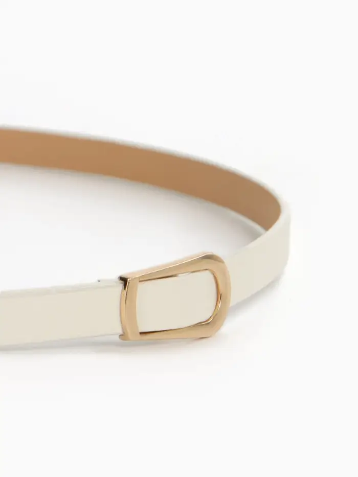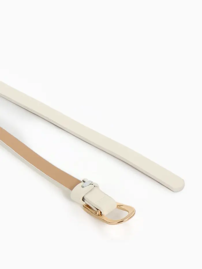 Узкий белый ремешок с золотой затягивающейся пряжкой — свежий акцент для летних образов. Минималистичный дизайн шириной 1.2 см подчеркивает талию, сохраняя ощущение легкости.