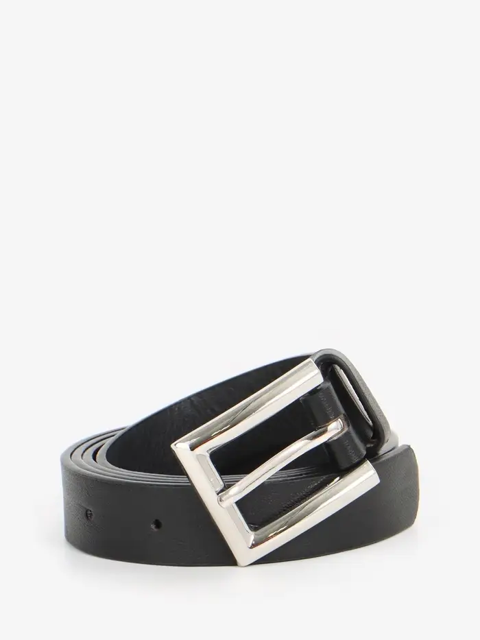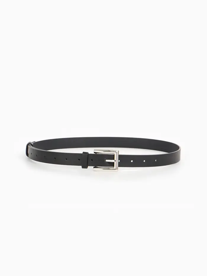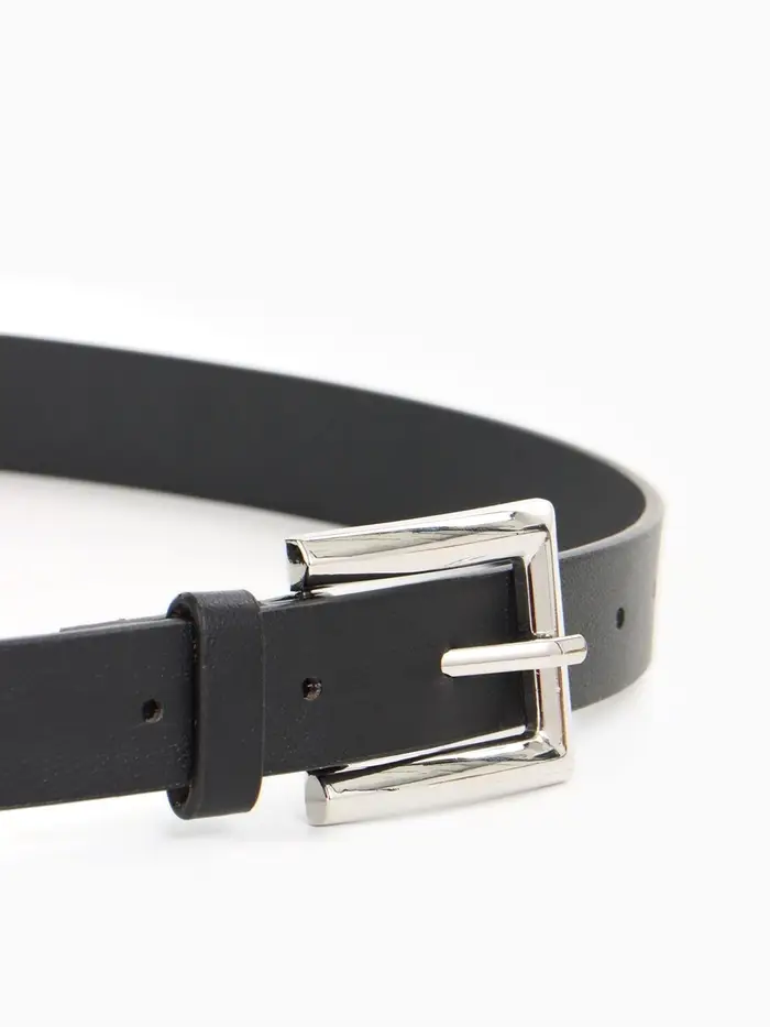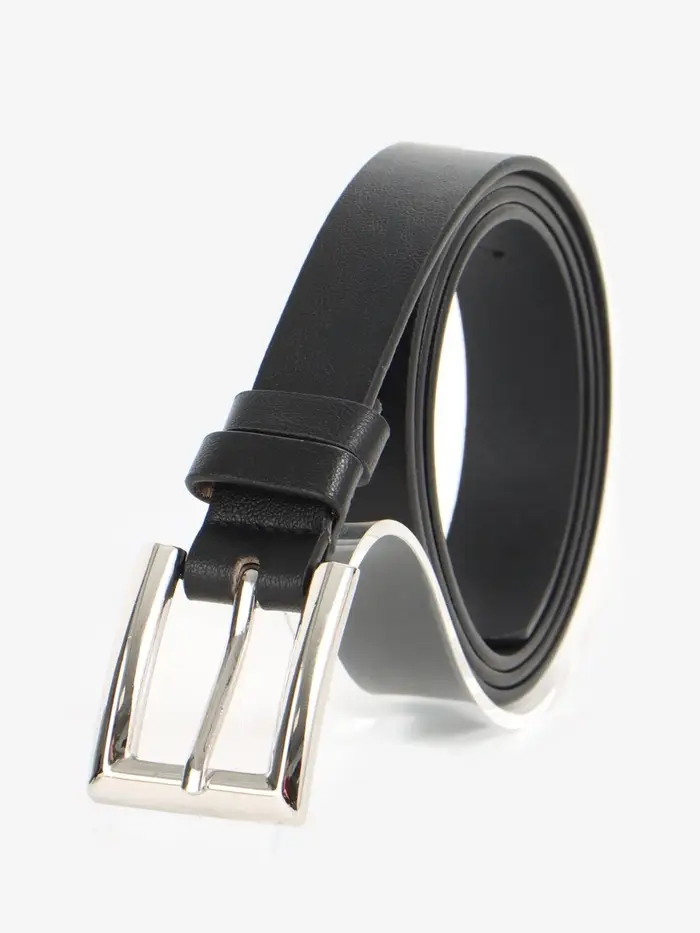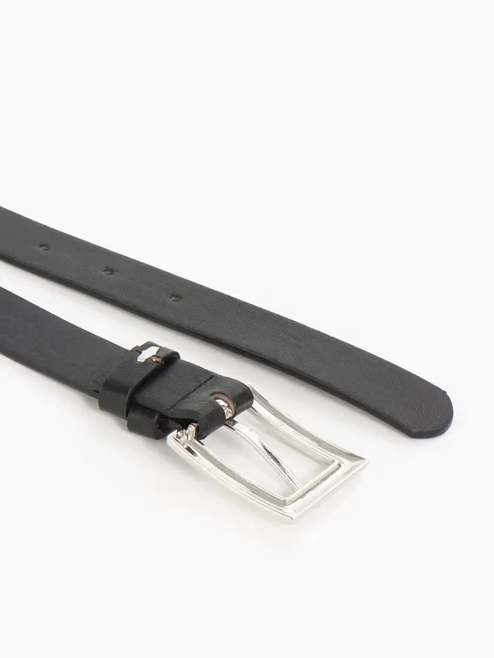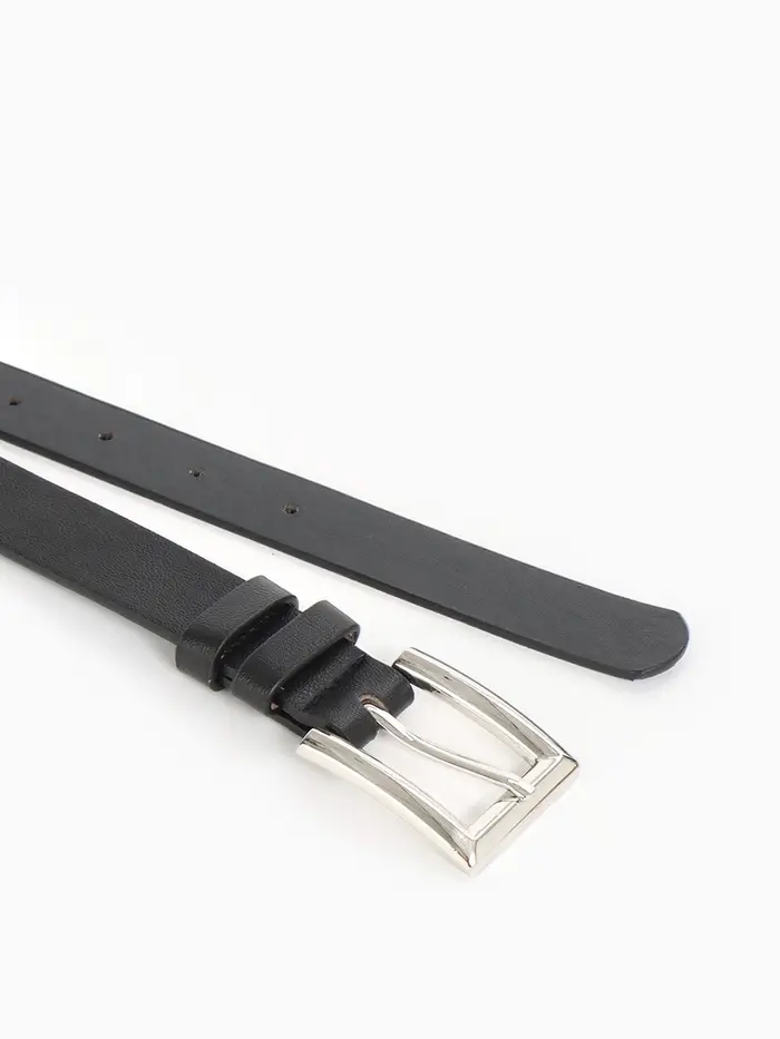 Универсальный черный ремень с серебряной пряжкой — элегантный аксессуар для женского гардероба. Средняя ширина делает его идеальным выбором как для брюк, так и для платьев.