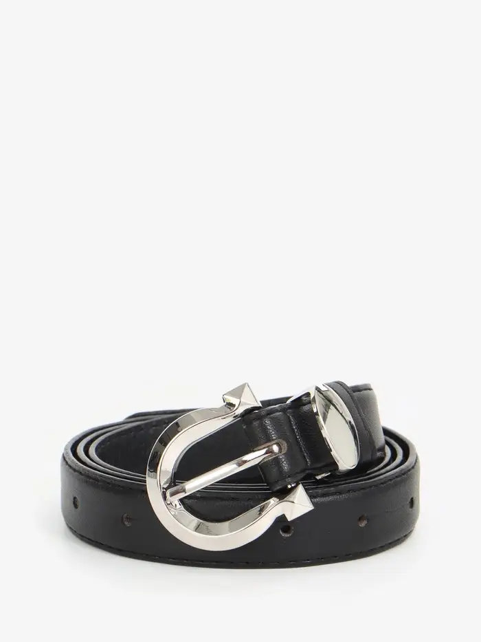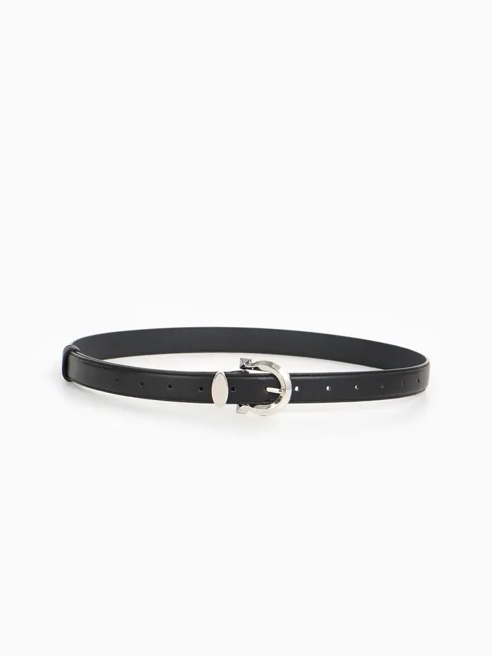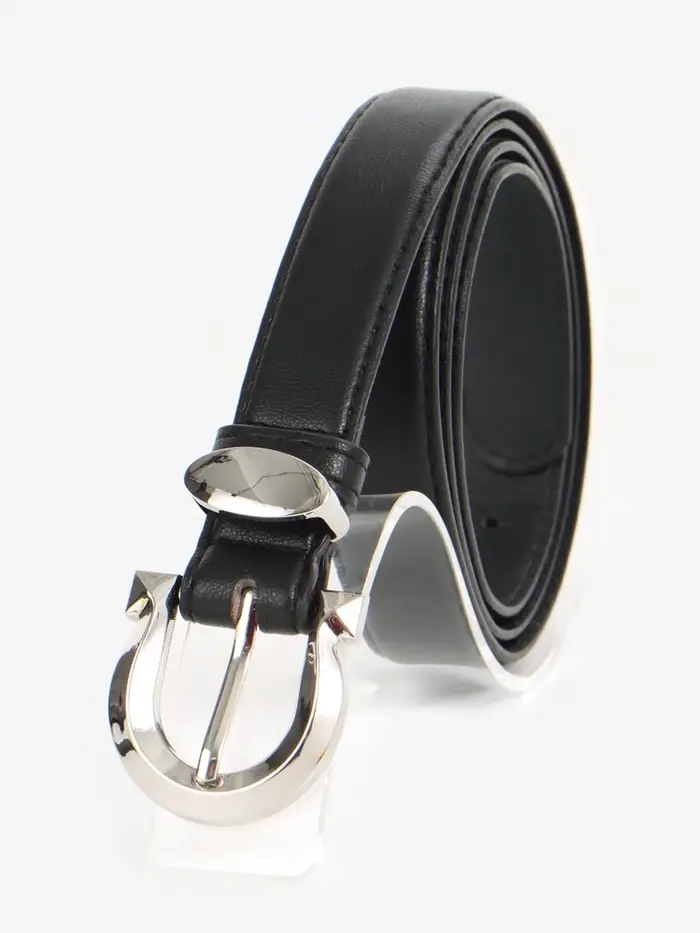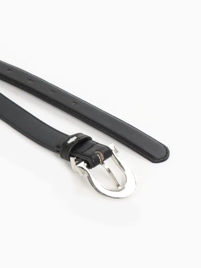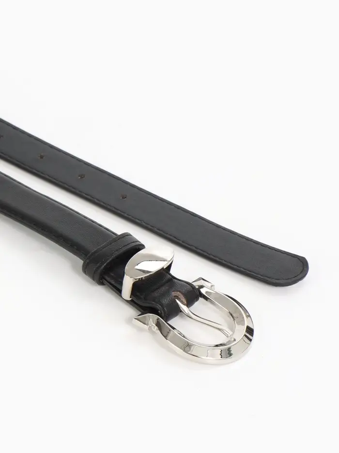 Классический черный ремень с серебряной пряжкой — универсальный аксессуар для женского гардероба. Ширина идеально подходит как для брюк, так и для платьев.