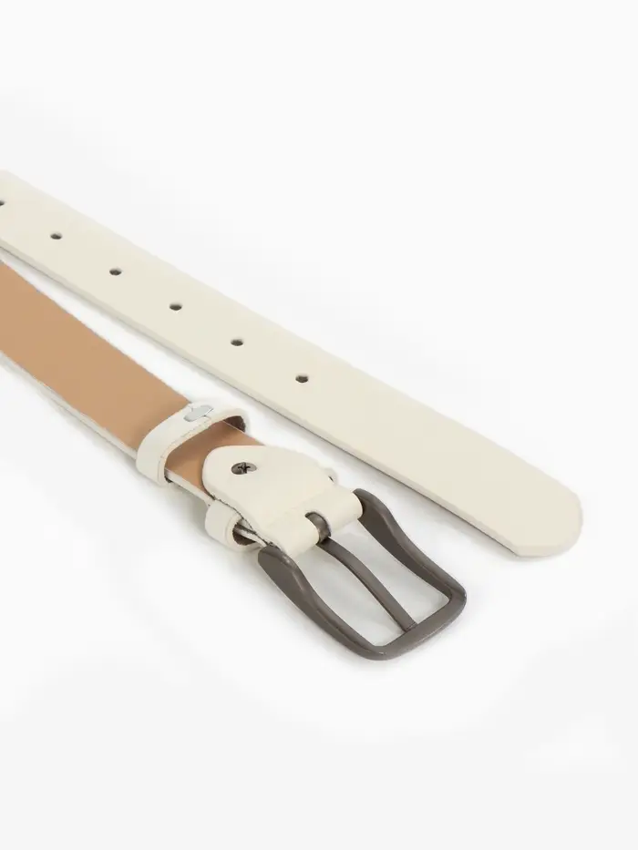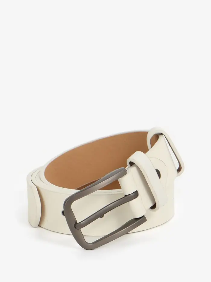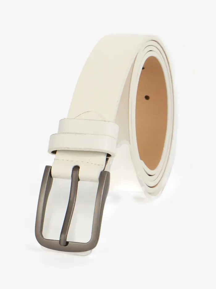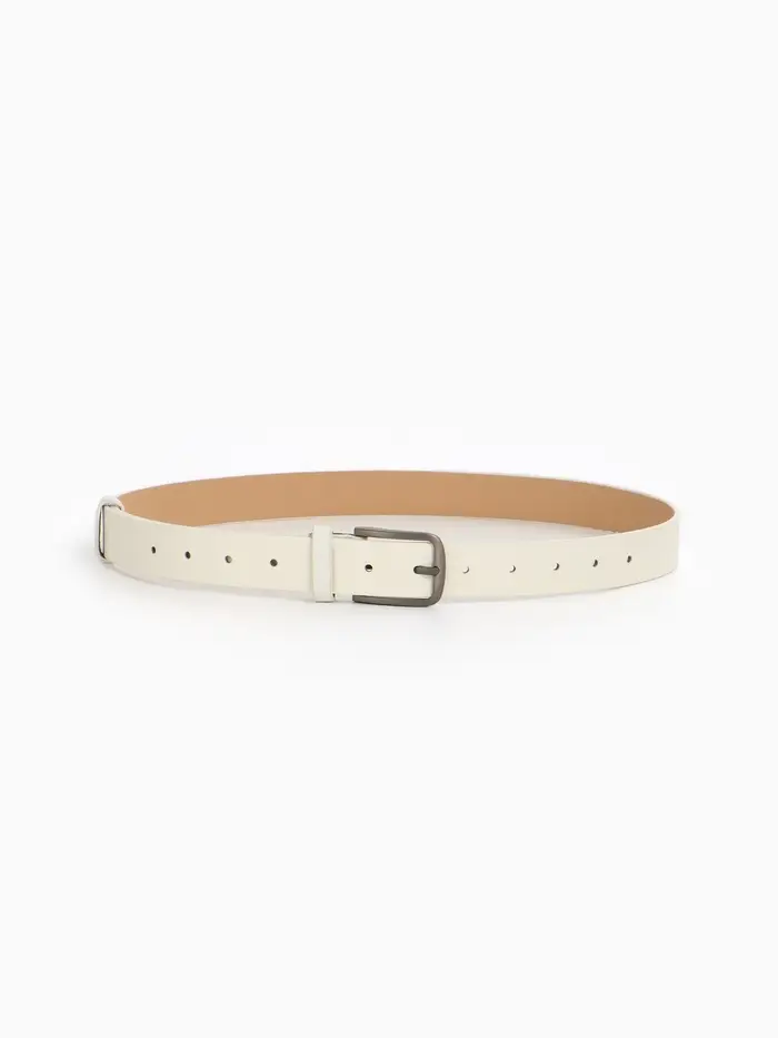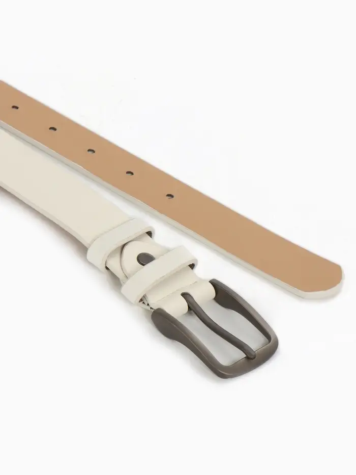 Широкий белый ремень с серебряной пряжкой — свежий акцент для летнего гардероба. Классическая ширина подчеркивает талию, сохраняя элегантную сдержанность. Искусственная кожа с матовой поверхностью устойчива к повседневной носке.