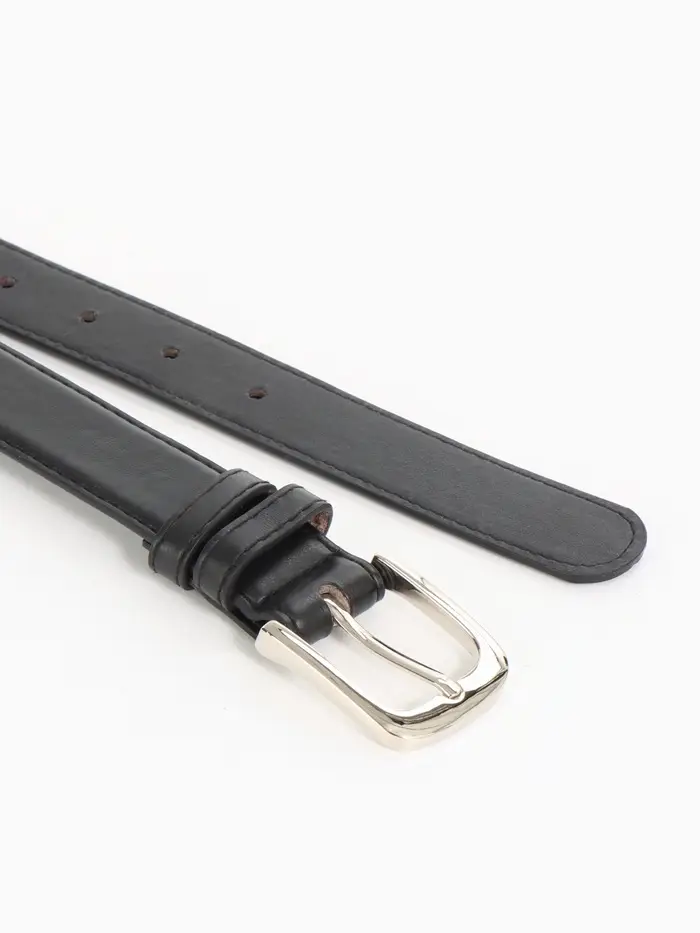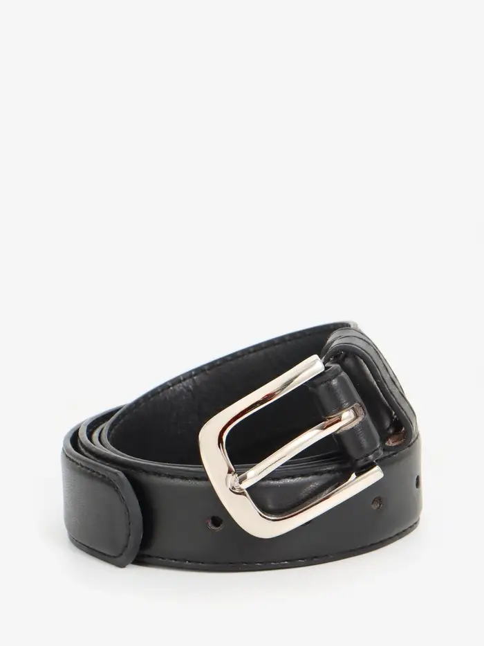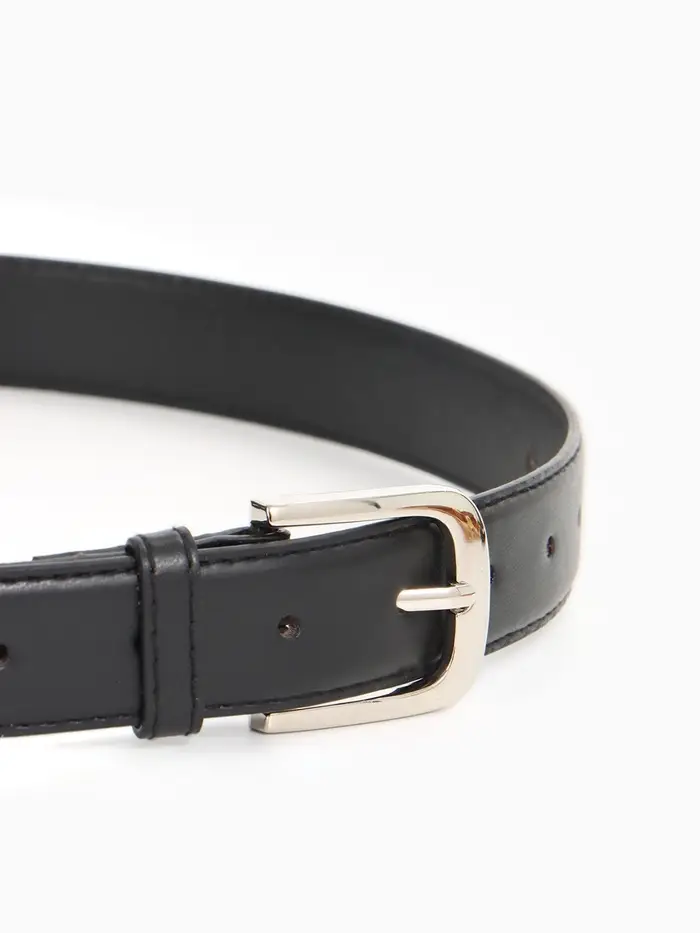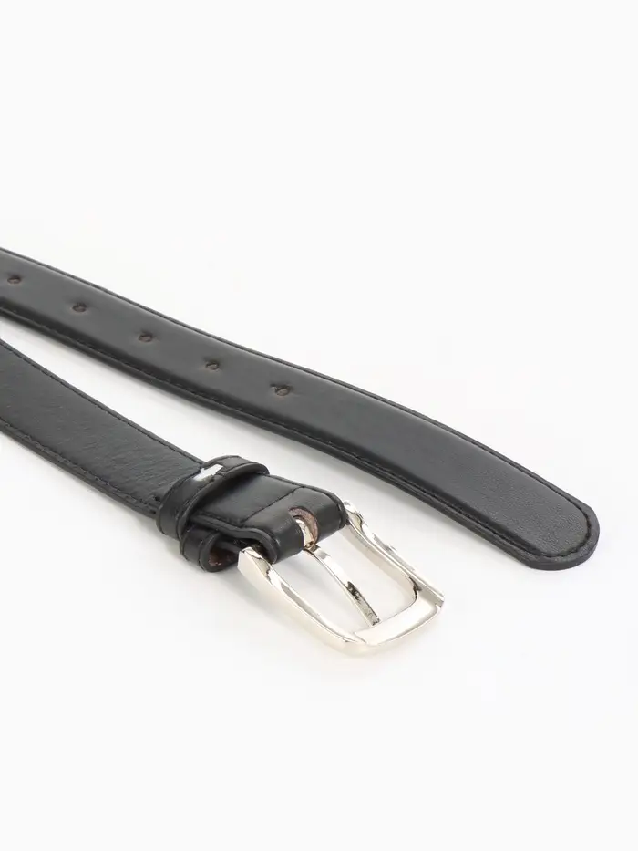 Классический черный ремень с серебряной пряжкой — универсальный аксессуар, который легко сочетается с разными стилями. Средняя ширина делает его практичным выбором для повседневной носки и деловых образов.