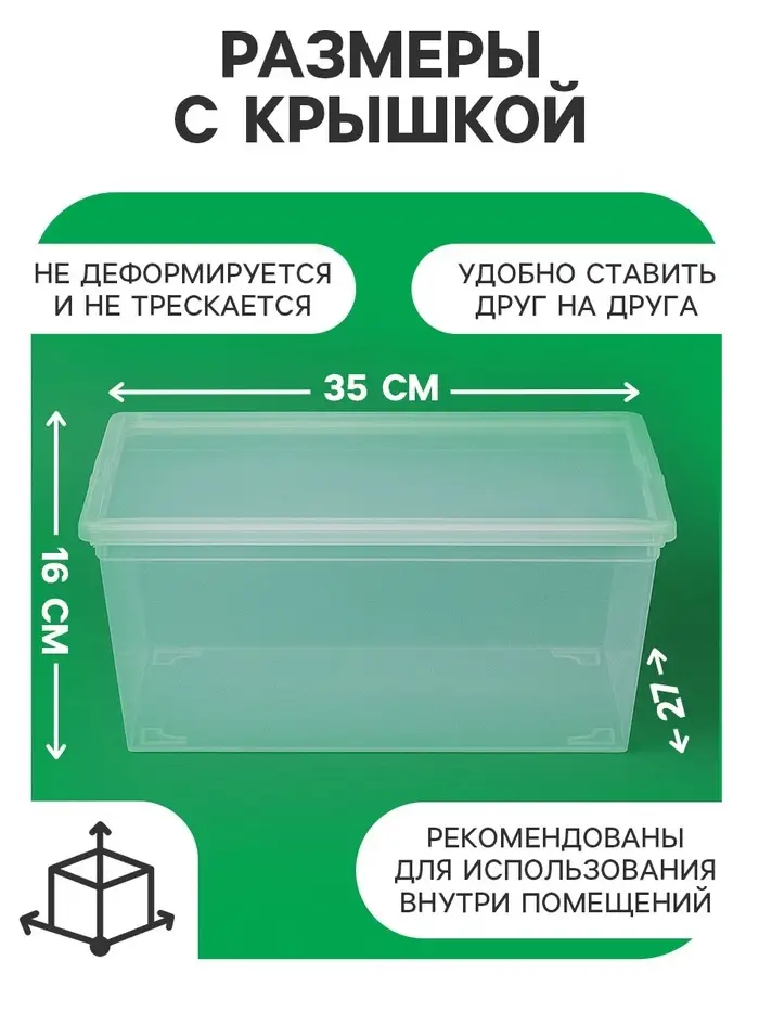 Практичный пластиковый контейнер с прозрачной крышкой. Просторная ёмкость объёмом 10 литров подходит для хранения мелочей, сезонных вещей, игрушек, канцелярии. Прозрачные матовые стенки позволяют видеть содержимое без необходимости открывать ящик.