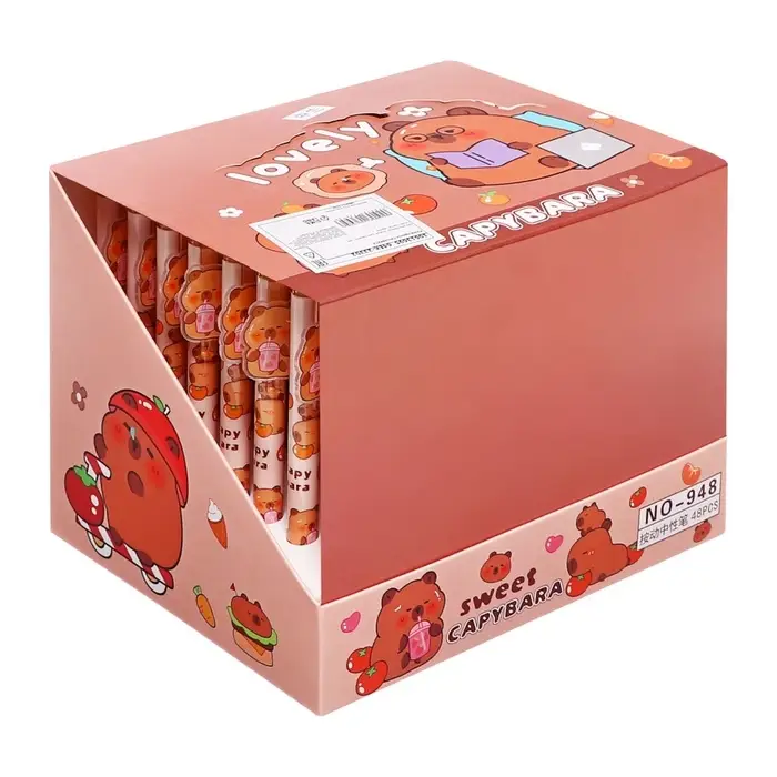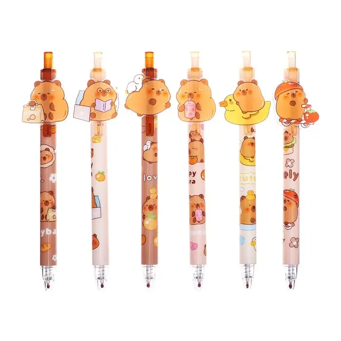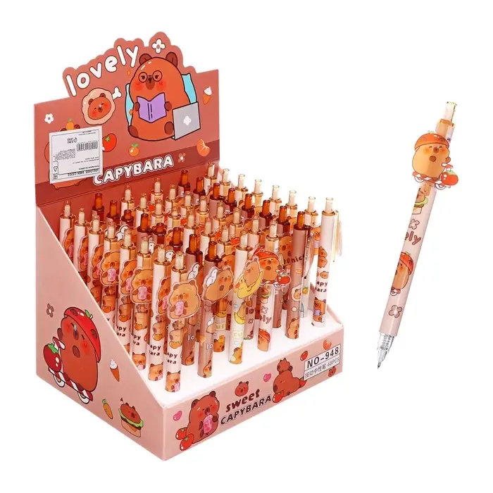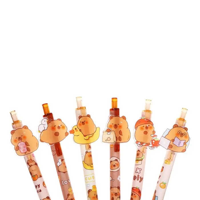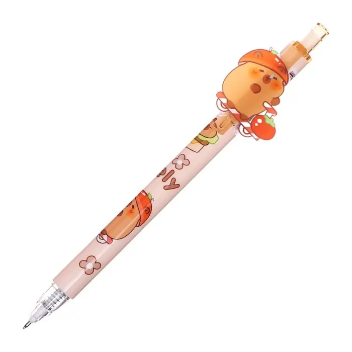 Эта гелевая ручка с милым рисунком капибары станет вашим спутником в ежедневных записях. Её тонкий 0,5-миллиметровый стержень оставляет аккуратные синие линии, а сменный стержень продлевает срок службы. Простой и надежный дизайн без грипа подходит для школы, офиса или творческих заметок.