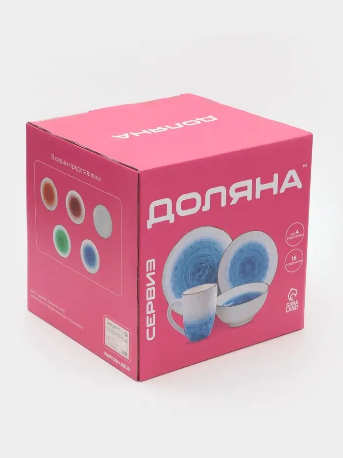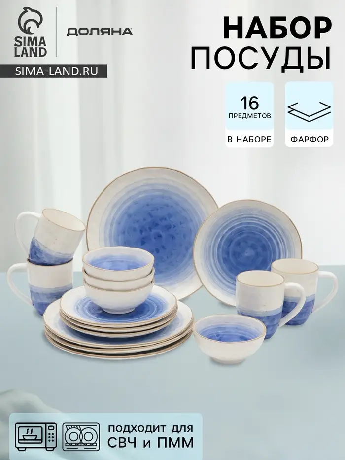 Набор посуды Доляна «Космос», 16 предметов: 4 тарелки d=21 см, 4 тарелки d=27.5 см, 4 миски d=13 см, 4 кружки 400 мл, фарфор, белый, синий