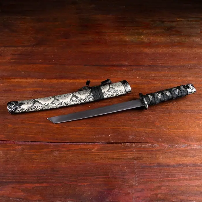 Подарите себе или своим близким уникальный элемент декора — это элегантная сувенирная катана на подставке. С длиной лезвия 19 см и бежевыми ножнами, оформленными под змеиную кожу, этот аксессуар станет настоящей находкой для ценителей восточной культуры и эстетики.