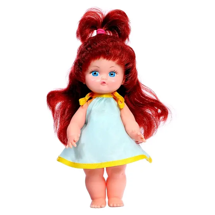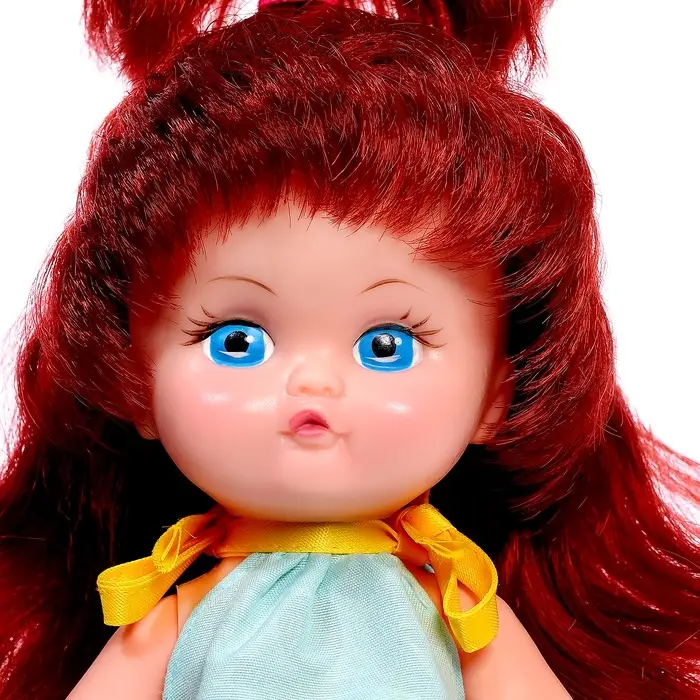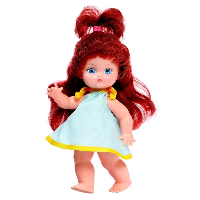 Пупс «Саша» — это яркая игровая кукла с выразительными голубыми глазками, длинными рыжими волосами и лёгким платьем в нежном оттенке. Контрастные жёлтые ленты на плечах и по краю платья делают образ более заметным и добавляют ему живости. «Саша» выглядит как персонаж для добрых повседневных игр, где можно придумывать прогулки, домашние сценки и маленькие детские истории.