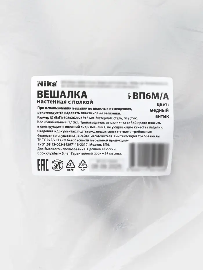 Вешалка настенная с полкой на 6 крючков, цвет медный