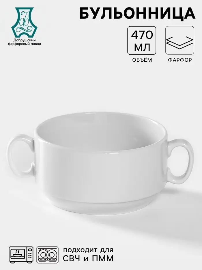 Бульонница Добрушский завод «Бельё», 300 мл, d=10.5 см, фарфор, белая