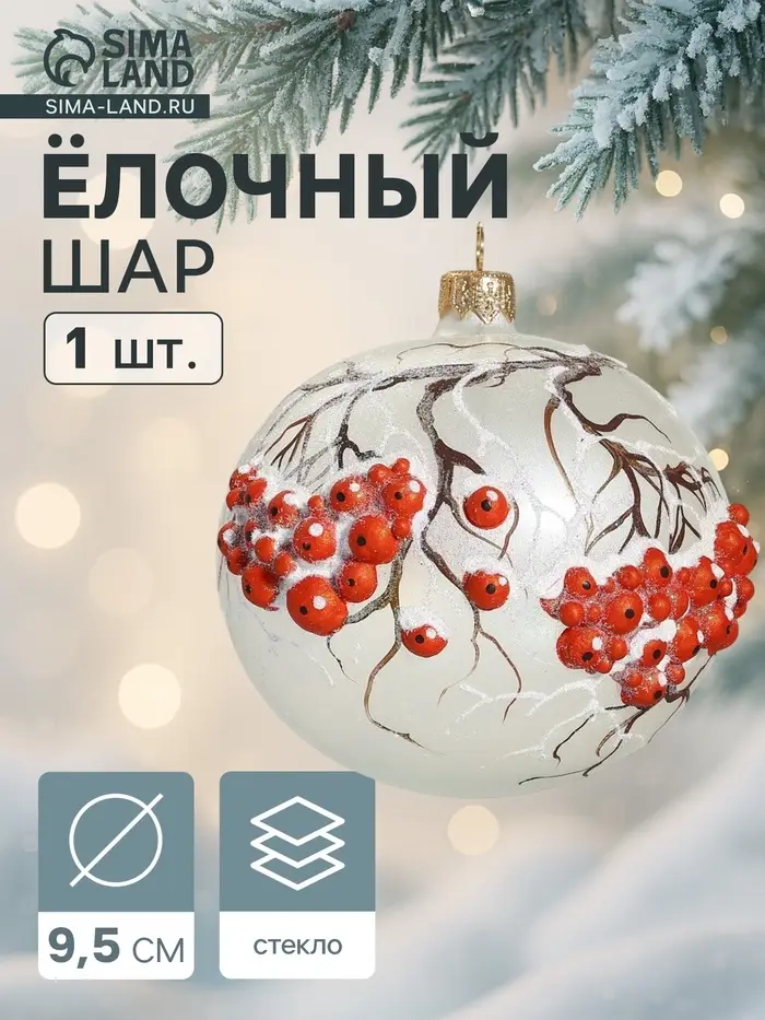 Новогодний стеклянный шар с рябиновыми гроздьями — украшение, которое гармонично дополнит праздничный декор, привнося нотку традиционности и элегантности. Бело-красная палитра и выразительный рисунок создают атмосферу традиционного праздника, объединяя советский и скандинавский стили в одном изделии, что делает его подходящим для разнообразных интерьеров. Диаметр 9,5 см подходит для разнообразных вариантов оформления ёлки, позволяя интегрировать шар в композиции разного масштаба и сложности.