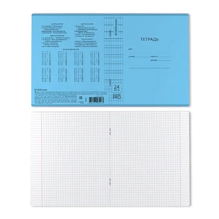 Тетрадь школьная ученическая формата А5+ (170x203 мм). Двойная обложка: внешняя выполнена из высококачественного износостойкого цветного пластика с фактурой «апельсиновая корка», внутренняя — из офсетной бумаги. В блоке 24 листа в клетку. Бумага офсетная плотностью 60 г/м2. Цвет линовки — синий. Скругленные уголки обложки и блока. Тип скрепления — скоба. Тетради упакованы в термоусадочную пленку по 10 штук.