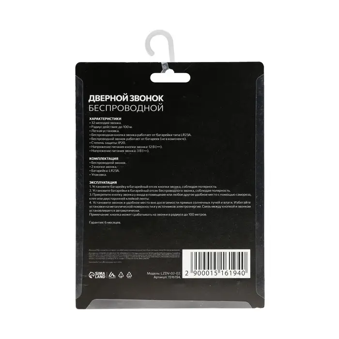 Звонок Luazon LZDV-02-02, беспроводной, 2 кнопки, 2хAA (не в комплекте), LR23A