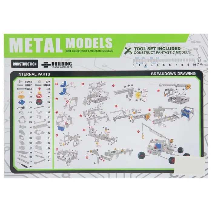 Конструктор металлический «Автокран» представляет собой набор для создания модели автокрана, способствуя развитию инженерного мышления и аккуратности при сборке.
