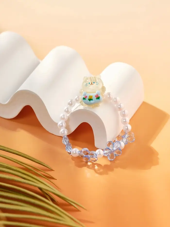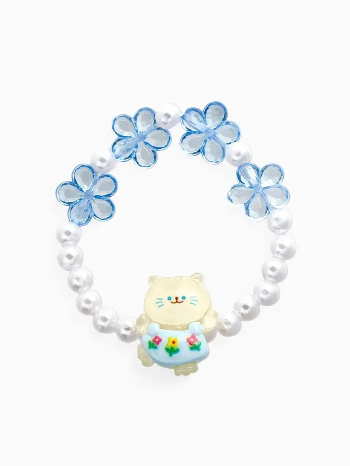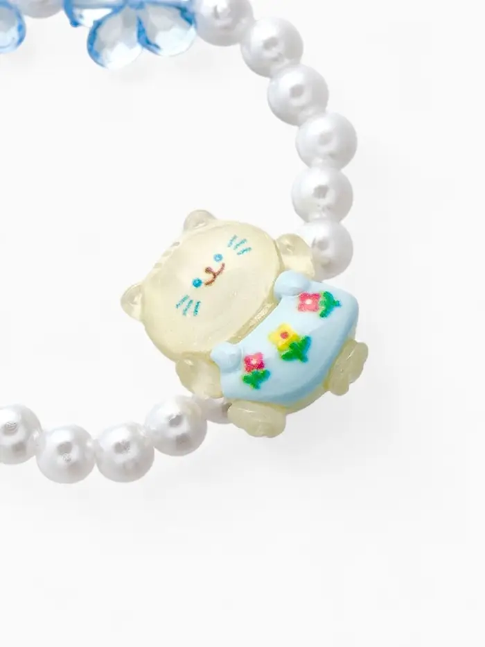 Нежный браслет с изображением котика и цветочными элементами — идеальное украшение для маленькой модницы. Диаметр 6 см обеспечивает комфортное ношение на детском запястье, а сочетание белого и голубого с жемчужным блеском создаёт лёгкий и воздушный образ.