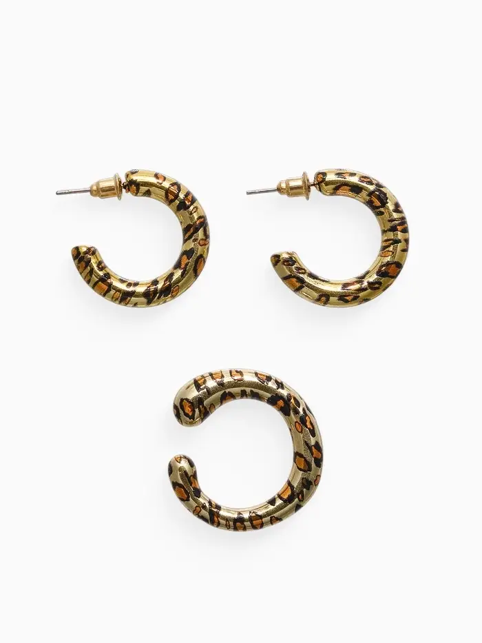 Золотистый комплект серьги и каффы с леопардовым мотивом воплощает в себе дерзкую элегантность и современный стиль. Лёгкий пластик с эффектным золотым покрытием подчёркивает изящество и динамику образа, а сочетание классической застёжки пусет и удобных кафф без прокола обеспечивает комфорт и надёжную фиксацию без лишних усилий.