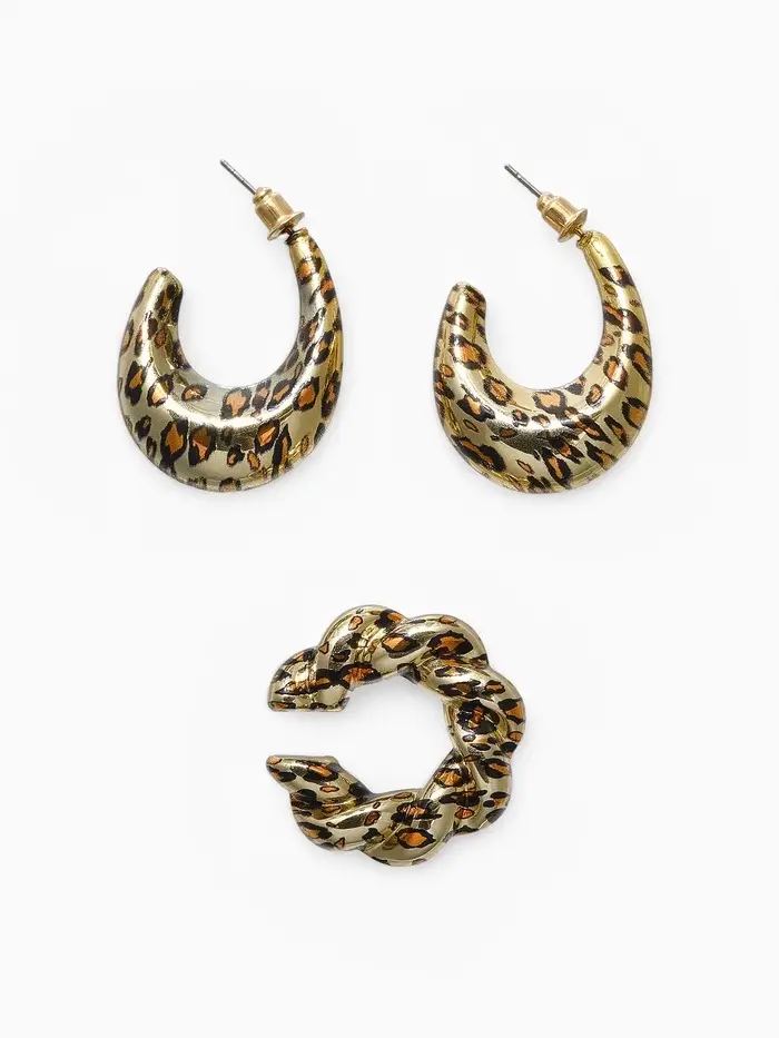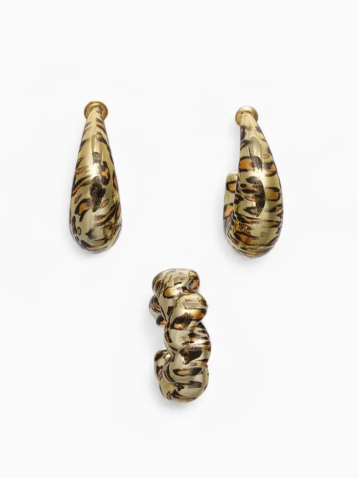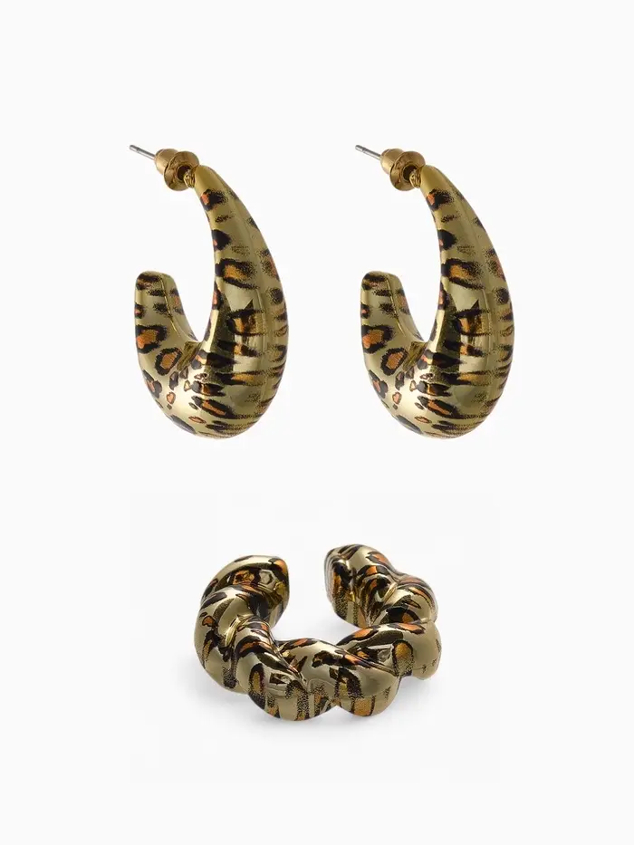 Золотистый набор серьги и каффы с леопардовым жгутиком — это стильное решение для женщин, стремящихся подчеркнуть свою индивидуальность и изысканный вкус. Лёгкий пластик с золотым покрытием создаёт эффект благородного сияния, который притягивает взгляды и дополняет любой образ.