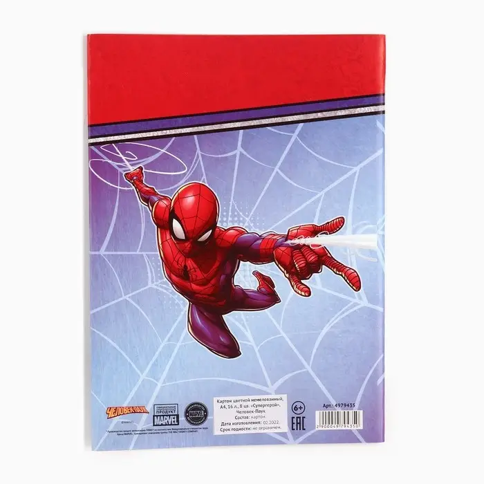 Картон цветной, А4, 16 листов, 8 цветов, немелованный, односторонний, в папке, 220 г/м², Человек-паук