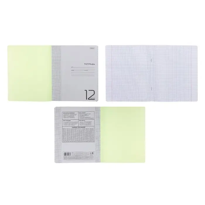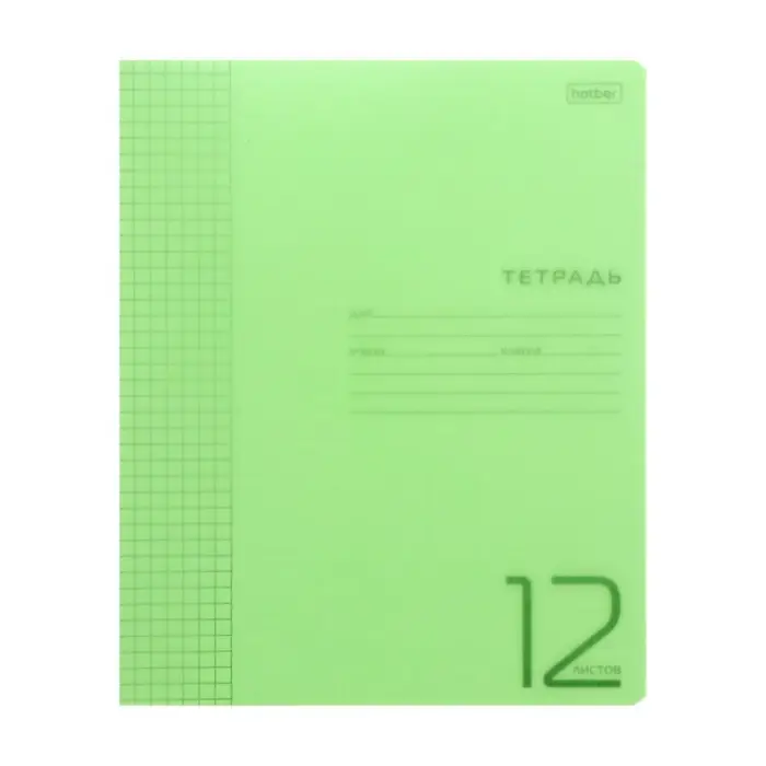 Тетрадь 12 листов в клетку, обложка пластиковая, зеленая
