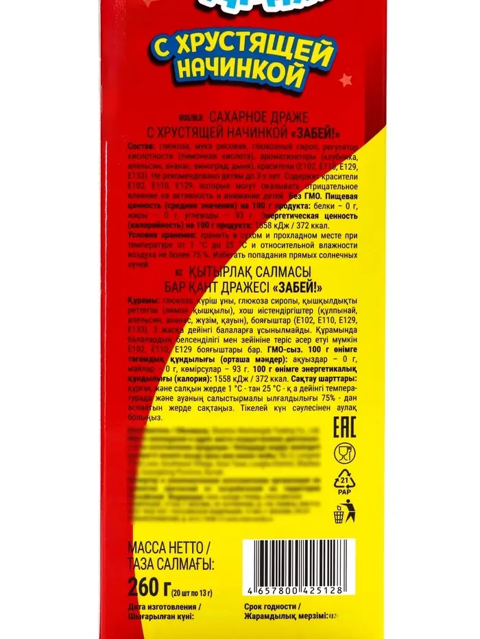 Добавьте ярких красок в сладкий праздник! Драже с хрустящей начинкой Забей – это сладкое угощение с насыщенными вкусами и хрустящей текстурой. Идеально подходит для украшения десертов или самостоятельного перекуса на любой тематике праздника.