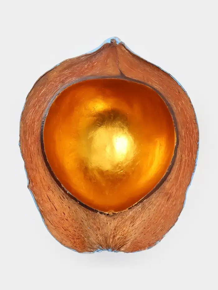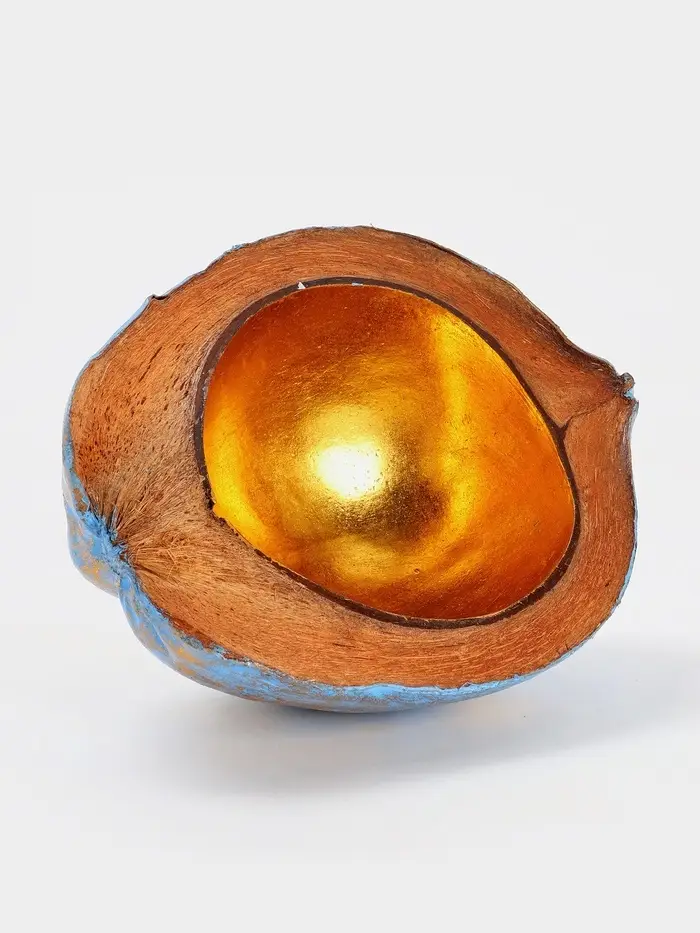 Чаша из кокоса — эксклюзивное изделие ручной работы в благородной сине-золотой гамме. Изготовлена из цельного кокоса с сохранением природного рельефа скорлупы. Фигурная форма с изящными золотыми акцентами создает эффект драгоценности. Не предназначена для горячих блюд, микроволновки и посудомоечной машины.