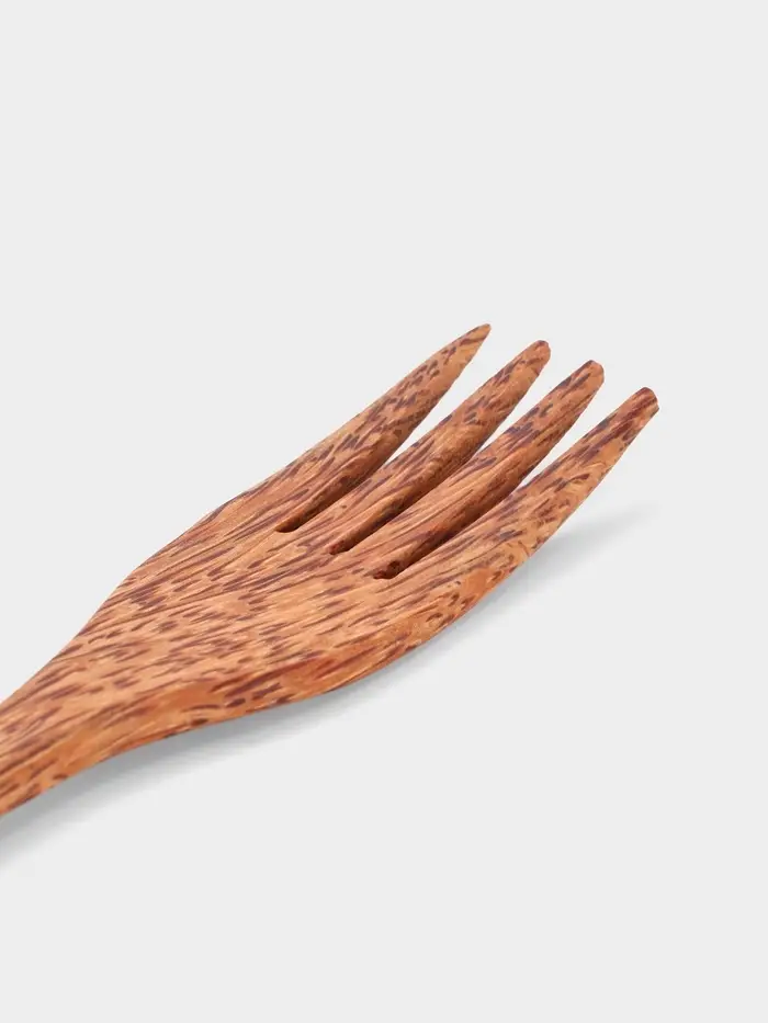 - Натуральный материал — кокос: Каждая вилка имеет уникальный рисунок волокон и приятную на ощупь поверхность. Кокосовая скорлупа отличается прочностью и долговечностью, сохраняя свой первоначальный вид при бережном уходе.