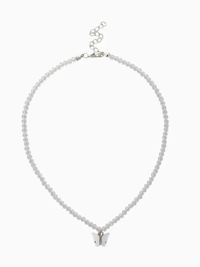 Чокер выполнен из высококачественного стекла, покрытого серебристым напылением, что создаёт эффект хрусталя, мерцающего при свете. Центральным элементом композиции выступает фигурка бабочки, исполненная в технике полистоуна, придавая изделию объем и реалистичность. Нежные переливы белых камней добавляют дополнительный шарм и позволяют украшать собой любой наряд.