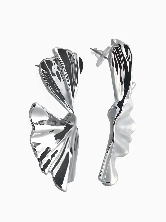 Серебристые серьги из пластика в форме асимметричных лепестков — это гармоничное сочетание минимализма и природной эстетики. Длина 6 см придаёт украшению выразительность, сохраняя при этом лёгкость и утончённость образа.