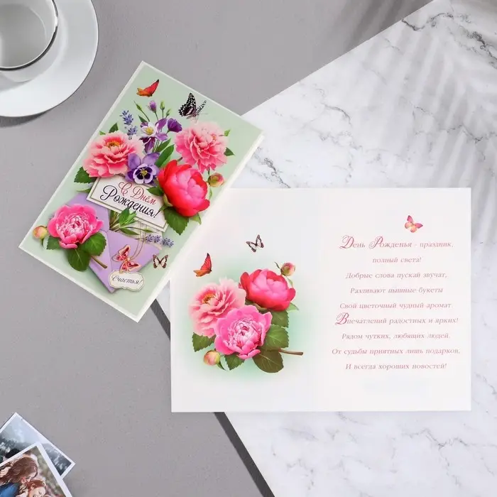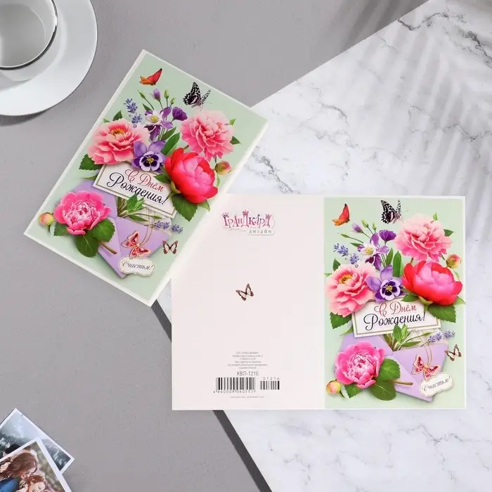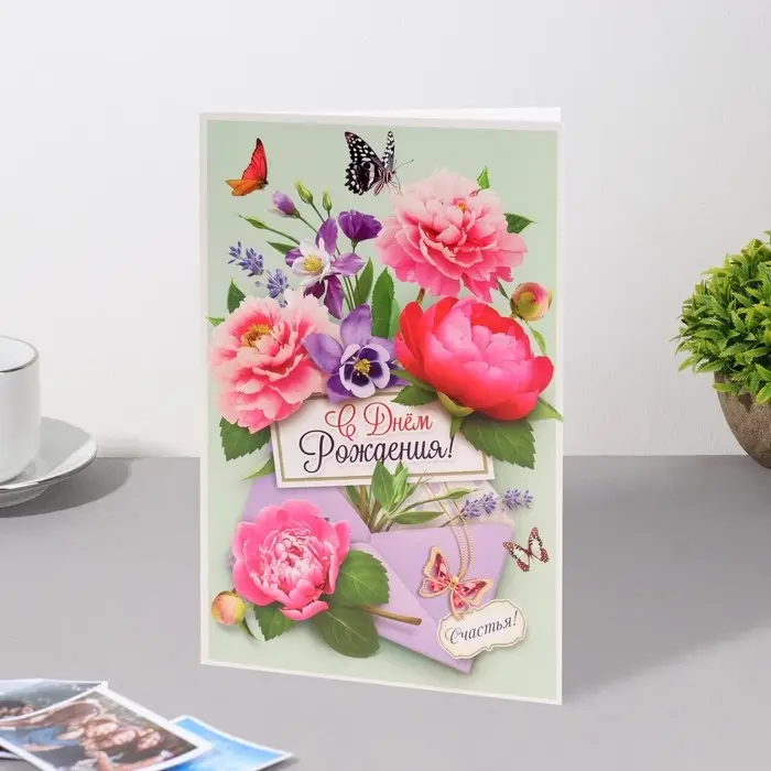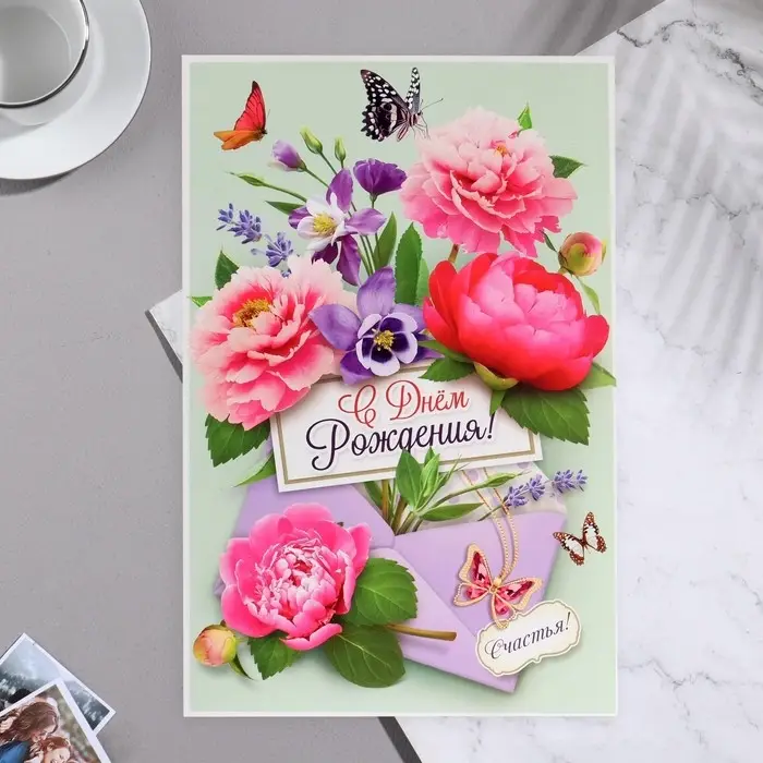 Открытка "С Днем Рождения!" цветы, бабочки, конверт