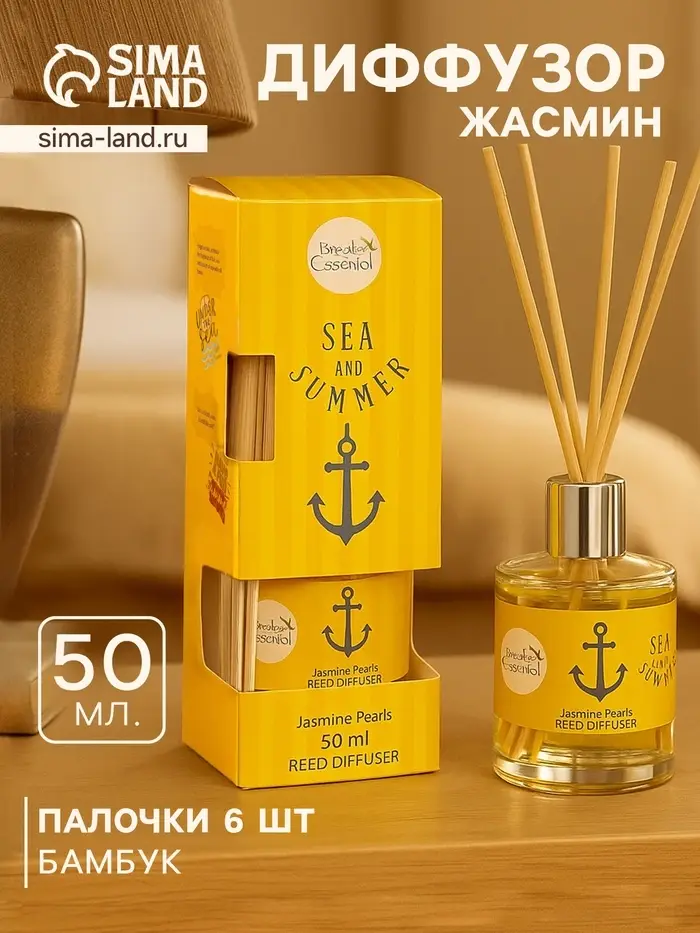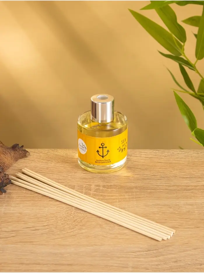 Диффузор Sea and Summer Jasmine Pearls с нежным ароматом жасмина. Объём 50 мл, в комплекте 6 палочек для равномерного распространения запаха. Создаёт лёгкую, свежую атмосферу, наполняя помещение нотками летнего цветения.