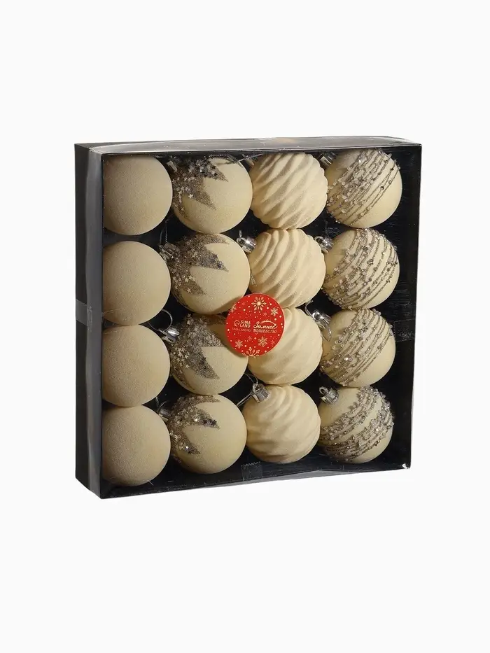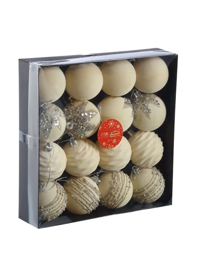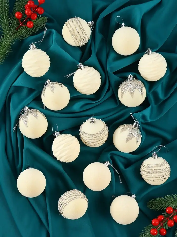 Набор из 16 белых ёлочных шаров диаметром 6 см с изящным узором в стиле бархатного маскарада. Пластиковые украшения подчёркивают нежность и чистоту новогоднего декора, создавая атмосферу зимней сказки.