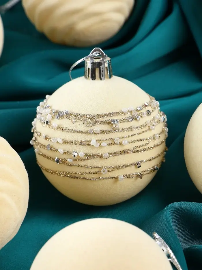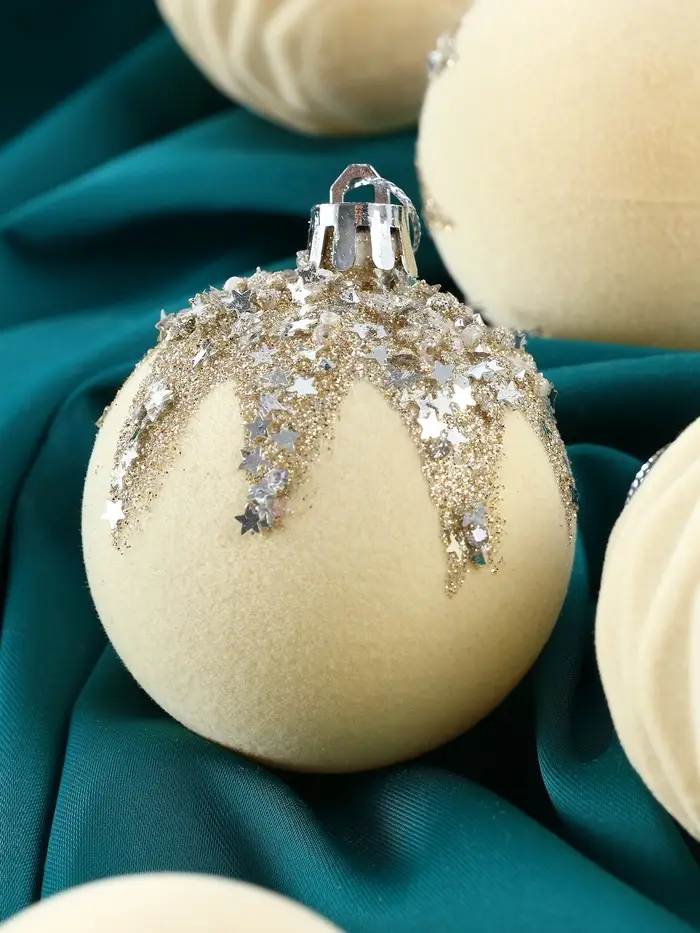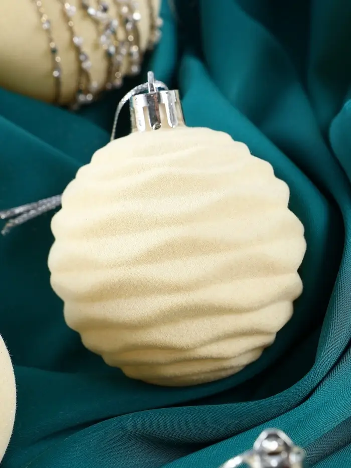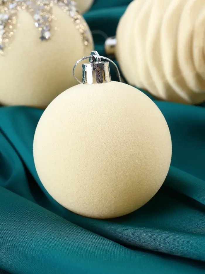 Эти шары придают ёлке утончённость и воздушность. Их бархатистый узор напоминает о маскарадных вечерах, добавляя нотки загадочности и элегантности в оформление новогоднего пространства.